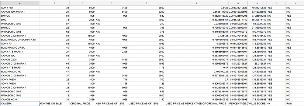 We all know that cameras are terrible investments. They instantly lose value when you open them and they’re no longer new-in-box, and then they steadily lose value over time. It really only makes sense to think of a camera as an investment if you’re a business buying a camera that will directly impact your ability to get work or if you’re a collector selling rare antiques. Otherwise, you can only plan on losing money on whatever camera that you buy. Buying a camera and expecting it to increase in value is usually really silly. At the same time though, cameras lose values at different rates. Some cameras command used rates very near their launch prices, and other cameras sell for way less than their initial price a year after launch. Importantly though, I think the value of a camera over time can show how forward-looking the company that launched the camera was with that model when it released it. A camera released in 2014 that’s still relevant right now had valuable features in 2014, but is also is still competitive in some way in 2017 (or 2018). I’m thinking that the forward-looking value of a camera can be calculated based on a few points of data: first, how long the camera has been on the market; second, how much the camera cost when it was initially released; and third, how much the camera is selling for used today. In short, I think the difference between what a camera sold for when it was released and what you can buy it for used today can show how competitive the camera is relative to other cameras. So, what I did was to search out data for some of the most commonly used cameras for video and analyze how old they are, how much they sold for when first released, and how much they sell for now. The short version is that I made a Google Sheet and compared the values of cameras over time to see which cameras held their values best over the months they’ve been on the market. The long of it is this: I made ten columns in a Google Sheet. The first column identifies the camera. I chose cameras that are most discussed on the blogs that I frequent, like this one, but I purposely excluded cameras that are also super popular in photography, like the 5D Mark II and III. Their used online value might be less attached to their video functions than others here. The second column is the number of months the camera has been on sale. I used the actual “the camera is available on B&H” date whenever possible. For cameras where the announcement date and the sale date weren’t hugely different, I didn’t make a distinction. For cameras (like some Blackmagic cameras) that were announced and didn’t go on sale until months later, I used the actual “available for sale” date when I could find it. I rounded to the nearest month. The third column is the original price that the camera sold for. The fourth column is the new price as of 12/19/17 (this is mostly for my curiosity and doesn't actually figure into any of the calculations). The fifth column is the used price as of 12/19/17-12/20/17. I used the lowest “Buy-It-Now” price from eBay (US) I could find for each camera, but I only accepted cameras that I would actually purchase (if I was looking for one) based on their being used but totally functional and coming from buyers with decent feedback. The sixth column is the used price as a percentage of the initial new price. For example, a camera that debuted for $2,000 and now sells for $1,000 is selling for 50% of its initial price. The seventh column is the percentage of value lost divided by the number of months the camera has been on the market. I found the percentage of value lost by subtracting the percentage of the new price that the camera sells for used from one. The eighth column is the tiny percentage from the seventh column multiplied by 10,000 to make it more readable. I’m basically creating a “value score,” where the lowest number is the camera that has retained its value the best. The ninth and tenth columns are whether the camera shoots in 4K or raw, respectively, because I wondered whether that would make an obvious difference. This is a graph with each camera’s “value score” (the percentage drop per month multiplied by 10,000), rounded to the nearest one. Essentially, the lower the score, the less value the camera has lost over time, or in other words, the better it’s retained its value relative to the number of months it’s been on the market. Here’s all the original data. So, basically the FS7 has lost very little of its value over time, while the Canon XC10 has lost a ton of its value over time. Most cameras fall in the middle range. Interestingly, every major company has a camera in the top five, and every major company also has a camera in the bottom five. Interestingly, 1080p and 2.5K cameras do pretty well by these calculations. The BMPCC, BMC, Panasonic GH2, BMMCC, and GH3 have all held their value relatively well, while a lot of 4K cameras have lost value relatively quickly. I wondered whether raw shooting cameras would do better, but I don’t think there’s a strong correlation. I’m sure there’s some complex relationship between resolution, codec strength, lowlight ability, sensor size, marketing, and a million other factors, but I don’t know what it is. Interestingly, it’s also possible that the most popular cameras sell for lower prices relative to their new prices because so many people have bought them and used supply is high when those customers decide to move on to new cameras. However each camera has maintained its value, I think the cameras with low scores were (are) futuristic in some way. They have to be to still be relevant today, or to have still been relevant so recently (in the case of the GH2). There’s a lot of limitations to my analysis. It’s mostly for fun and to drive discussion. First, the eBay prices are a tiny sample over two days. I’ve seen cameras go for a lot lower than the prices listed here. I saw