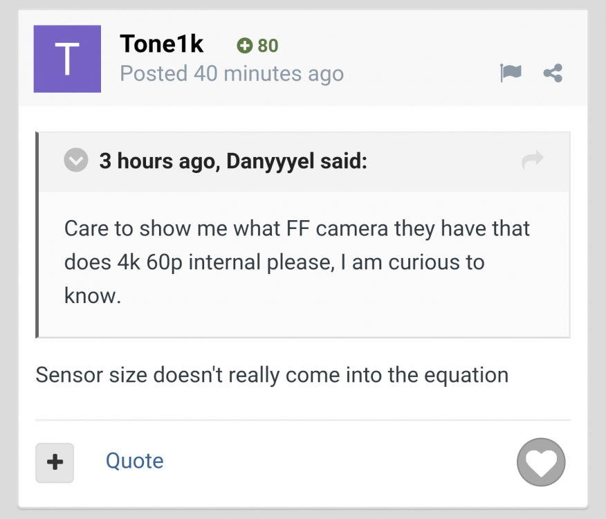 That is curious logic. They reference a crop mode for 1080p - What makes you make the assumption that it has anything at all to do with a 1.6x crop in 4K? Just seems like an odd leap. The crop they have (on all the previous 4K cameras) is a 1:1 crop of pixels. That's what dictates the crop size. Obviously we don't know about a pixel binning or full sensor read option. Again a kind of ridiculous comment. "what if they could only take one photo before they explode?!" Sorry where is the moaning about the 'crop' on the more expensive GH5S? Or the Leica SL having only S35 4K? You seemed to like that camera well enough. How much did people bang on about the GH4 and pretty much every Panasonic (including new ones just released) other than the GH5? Indeed. Here's a list of cameras (that I know of) that you have bought with 4K 'crops': GH4 Leica SL A99 II (same as A7R II) A7R II (full frame was unusably bad, supersampled S35 was way better) A7 III (crops in 30p) X-T2 X-H1 GX85 1DC NX500 Need I go on? It has literally been the latest round of camera powered by Sony sensors that haven't needed it. And? Isn't that the same bitrates as Panasonic are 'famously' providing in their superior video abilities? Not even remotely a problem. The last thing of any real expense is memory cards on a long professional shoot. I seriously doubt I would use ANY of these toys on a long professional shoot. Ok now you're making digs, don't like having people disagree with you huh? Funny last week I was named a Sony fanboy. What's the reality? Why? Because you're so angry at the 'fanboy' that you'll just lash out at BS for the sake of it? Defend what? 100Mbps 8bit 4:2:0... You're in dream land. S35 the only way to get decent video quality... Yeah sounds like it's thumping the Canon already Oh please do tell me what the 'and so on' is? Nikon only has Log on HDMI out and same with 10bit. Are you going to shoot everything to an external monitor? Or are you going to stick with the dreadful internal 8bit with no Log? Worse AF. Pathetic line up of lenses. Sounds super! At least use a Sony... Still didn't answer the question. The M5 has no 4K, so how does that sensor 'still' have a 4K crop. It is the first time it was used. So is it a new sensor? Or the same? "M50 has a wild 4K crop" Brillant, well done. This is definitely true. Sony provides all those other brands that would be up the creek without them... No DFD with Olympus (or anyone else's) lenses, even half of Panasonic's range. Weird mix of what does and does not work with the mixed IS. Clutched MF / AF works differently. Digital corrections. Sensor reflections due to different filter stacks. How do they suit? Then there is the huge difference in IS strategies between brands, that one's always fun. Context?1 point