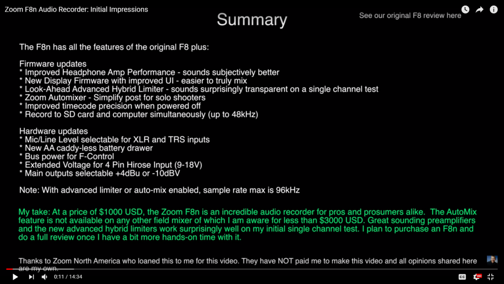 I wrote up quite a long comment on YT, and thought I'd share my thoughts here as well for wider consumption as it is relevant to this thread as to why I feel the F8n is the best choice in the marketplace right now for this niche (beating out the MixPre competitors): Something I didn't touch on is price, as it was fairly irrelevant to my points above (except how the MixPre10T creeps up near in price to what a 633 costs), but worthwhile considering if price matters to you: MixPre3: more expensive than a Zoom F4 (but the MixPre3 records half as many inputs, and has less features). MixPre3 + TC: more expensive than a Zoom F8 MixPre6: more expensive than a Zoom F8 MixPre6 + TC: more expensive than the new Zoom F8n MixPre10T: more expensive than the new Zoom F8n + Zoom FRC-8 + iPad Mini!!