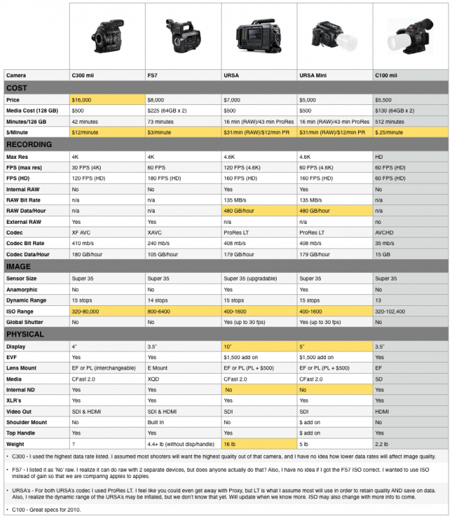 For your convenience, attached is a comparison spec sheet that I created for what I consider 'current' video cameras that would find there place above a DSLR camera, but below a RED package. By all means let me know if I have added incorrect data or left out relevant info. I will edit the chart and resubmit. I have highlighted in yellow some of the specs that jump out to me. I realize the '$/minute' line is unusual, but it's my attempt at making that info an 'apples to apples' comparison. EDIT: Added Global shutter and HD fps. Have decided to leave out Kinefinity. EDIT #2: Updated C300 and C100 top handle info. C100 DR. Interchangeable mounts for C300. Upgradeable sensor for URSA. Changed the 'RAW' line to 'Internal RAW' line. Added 'External RAW' line, and other than this line, I am going to stay away from external devices for this comparison. As soon as you factor external recorders, displays, or external anything the scenarios become infinite and the costs become distorted. The media type and costs may change as well. Those possibilities are fun to consider, but I can see that becoming way too messy for one chart. EDIT #3 (4/23): Changed C300 HD fps to 120. Changed FS7 Max Res to 4K. Changed URSA Max Res fps to 120. Camera Comparison.pdf