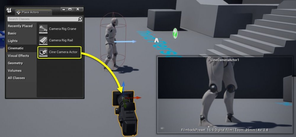 Step 3 - Start your engines.. So, a few days on and where are we up to ? I'm happy to say that we have moved forward but, obviously, its a very long journey so the extent of that movement is all relative. I'm happy to see though that @majoraxis has put together a good primer regarding the projectors for when (or if 😉 ) I get that far. First step forward was installing Unreal Engine and the first decision there was whether to use the current version 4 (4.27 to be precise) or the early access version of the upcoming version 5. Both versions are free so the choice for me really was to stick with the current v4.27 release version as its more of a known entity so the learning resources are more plentiful, which is important whilst I'm just paddling in the shallows. There is also less of a resource requirement in terms of the machine to run it on which, as I'm using a MacBook pro that is really long in the tooth, is a big factor. Going into this, I am well aware of the limitations of the 1.5gb built in Intel graphics of my MacBook so there is no point trying to explore what v5 brings to the table as judging by the hovercraft noises coming from it when I'm running v4.27 then I'm guessing running v5 would require a fire extinguisher to be at hand. You can have both versions installed on your machine though so if you have a suitable machine then go for it. Just to briefly touch on why v5 is a big deal, the primary aspects are two elements called Nanite and Lumen which offer huge advances in terms of detail and lighting control as discussed here : Obviously, v5 will be the ultimate destination but thats some way off yet, particularly considering that a wallet damaging computer upgrade will be required. As what I'm interested in doing first is applicable to both versions then it can wait anyway and I'll be working in v4.27. OK, so just circling back to the fundamentals of what the hell Unreal Engine is and using very broad brush strokes to discuss it... (apologies for the baby steps) It started as the engine used to produce a game called Unreal back in the late 90s (the clue was always in the name 😉 ) and was then licensed to other game developers over the subsequent years using various licensing models to its current status where it is free of charge in terms of royalties for products grossing less than $1m. Which means its definitely completely free for us ! You can read more about its history here https://en.wikipedia.org/wiki/Unreal_Engine Such is its longevity, ubiquity and support of all gaming platforms, its fairly likely that if you have played any games more graphically challenging than Pong in the past few decades that you have already experienced something created with Unreal Engine. If, like me, you have been playing more recent titles such as those that have had you running around Midgar lashing Materia at anything with a Shinra logo on it then you will have noticed how much more cinematic everything is. There have always been the pre-rendered cut scenes that have always looked cinematic of course but now the real time in game content is also taking on an increasingly cinematic look thanks to the simultaneous advancement in machines we are playing them on with the tools in Unreal Engine to simulate the aesthetic. Bringing this down to two very basic elements, Unreal Engine offers you the ability to build and light the set and then provides you with the camera with which to capture it. In real time. And of course, as this emulates the exact paradigm of real world production, the advancements in those two elements is what has sparked the interest in using it for virtual production. From my point of view, the creation of the set is secondary at this point as I don't have the skills or the time at the moment to be creating the assets but, fortunately, I don't have to as there is plenty of starter content that is freely available from the Marketplace for Unreal Engine that we can use to get going. For me, this is all about the virtual camera as this is what we will see the scene through and what we will be looking to match to a real camera so all the initial work I've been doing is using very simple sets and seeing what I can do in terms of operating the virtual camera. The virtual camera has all the same elements of a real camera in that you can not only move its position, change the lens focal length and aperture etc but also control its processing elements such as white balance, ISO and shutter speed. In the parlance of Unreal Engine, this virtual camera is referred to as a Cine Camera Actor and here is an example of how you see it within the editor. So as you can see in this example, we have the Cine Camera Actor pointing at the figure inside the set that has been created and in the bottom right you can see its generated viewport of the scene based on its current settings. The Cine Camera Actor has all the same elements of a real camera in that you can not only move its position, change the lens focal length and aperture etc but also control its processing elements such as white balance, ISO and shutter speed and all these changes that you make will be reflected in the generated viewport in real time. So, if we change the focal length to be wider then we will get the matching field of view, if we move the position of the camera we will see a different part of the scene, if we open the aperture we will get a shallower depth of field and so on, exactly as it would with a real camera. How we make those changes in real time as we would with that real camera will be covered in the next enthralling episode 😉
