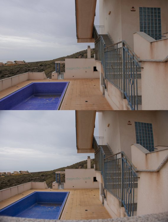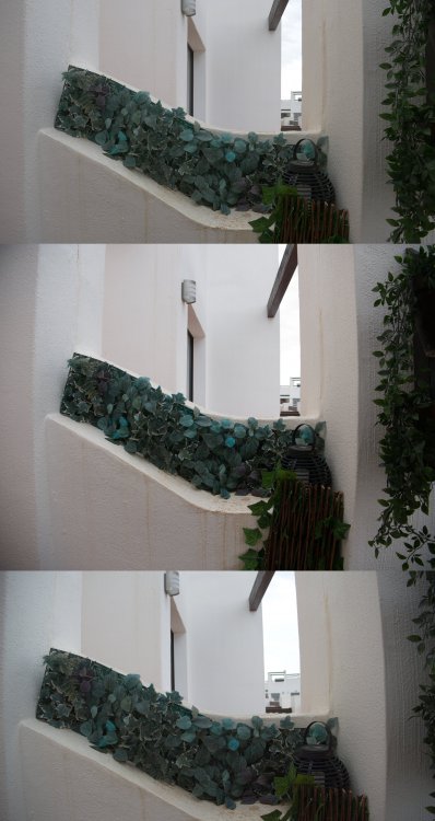 Here is an example from my Sigma FP shooting simultaneous JPEG+RAW stills with the JPEG on the top and the RAW on the bottom. The only differences are the expected ones regarding colour, contrast, WB etc baked into the JPEG by whatever profile I had active in the camera at the time. This next one is from yesterday on my LX100 shooting RAW+JPEG, again straight out of camera with the JPEG on the top and the RAW on the bottom. With this one we again have the expected differences from the JPEG profile but obviously from the RAW you can see the large amount of optical correction that the camera is performing to remove the distortion etc of the lens for the JPEG. From the point of view of operating the camera, this is irrelevant as it has happened before it hits the EVF or LCD so your framing view will be of the corrected image. In terms of the JPEG or if you are shooting video then, again, its an irrelevance as the corrections are baked in. For RAW files though, the corrections are not applied but they are only a click away in your editing software so, again, its no big deal. The problem would come though if you somehow managed to remove that lens and put it on a camera that doesn't have the correction built in. Which brings us to using MFT lenses on a Pocket 4K. I've just gone outside to do this quick and dirty illustration of a typical example with the Panasonic/Leica 12-40mm f2.8-4 on my Panasonic GX80 shooting RAW+JPEG and Pocket 4K shooting CDNG. On top we have the JPEG from the GX80, then the RAW from the GX80 in the middle and finally the CDNG from the Pocket 4K on the bottom. (* I was shooting 16:9 stills on the GX80 with regard to the JPEG but the RAW file is still 4:3) Ignore the framing and colour differences as it was just a quick handheld test but as you can see the in camera corrections have taken a large amount of the distortion visible in the RAW away when producing the JPEG. However, this is not the case with the P4K frame and without the in built correction the distortion is there in all its glory as it was with the RAW file on the GX80. Of course, you can perform the corrections yourself on the P4K footage when you are editing but its another step and will have to be done on every clip. There is also the penalty of the correction necessitating some degree of cropping in most cases so, unlike the cameras with built in correction, you will have to take this into account for your framing when shooting. The degree to which correction is necessary will vary a lot from lens to lens and obviously wider angle lenses will need closer attention hence why I would recommend checking each particular lens on the P4K itself before buying to make sure you are comfortable with it. I think the Voigtlander 17.5mm is quite popular on here with people using MFT cameras so if someone could do the same RAW+JPEG still on a GH5 etc then you'd have a fair idea of how it will behave uncorrected. I think a few people use it with the P4K too so that would obviously be even more indicative.