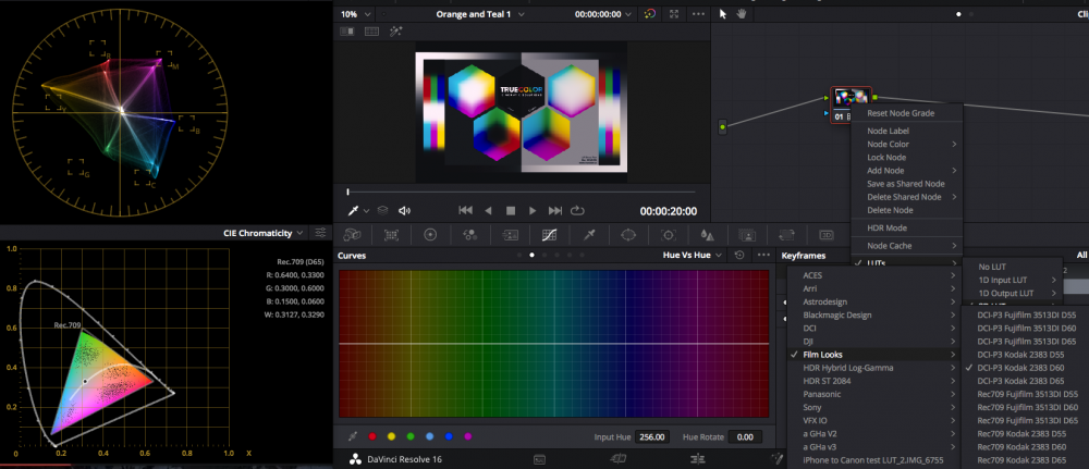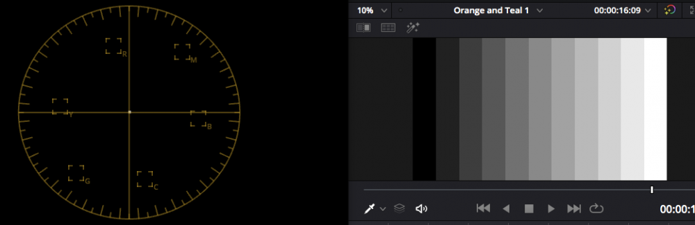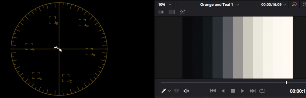 Let's start with film emulation. Resolve comes with a bunch of Film Emulation LUTs, let's play with the Kodak 2383 D60 LUT. Firstly, here's a greyscale to see what it does to luminance: The first is unprocessed, and so has nothing on the vectorscope as there is no colour. The second clearly shows that there is a push towards orange in the highlights, and a push towards teal in the shadows. If we change to a smoother gradient and zoom into the vectorscope further (by saturating the image hugely), we get this: From this we can see that it saturates the upper and lower mids more than the highlights and shadows, and that it isn't a straight application of two hues, but the hue varies. If we crop out the highlights and shadows in order to confirm which bits of the image are which bits in the vectorscope then this is what we get: Which confirms that the 'hook' parts of the vectorscope were the highlights and shadows. So there are changes in saturation and also hue applied to greyscale tones, but this is the OT look in this film stock. I suggested to the guys on LiftGammaGain that the film emulations in Resolve must be pretty good and was met with skepticism, however, if we assume that any lack of rigour on the part of the person creating these LUTs would tend towards making them overly simplistic rather than overly complex (a relatively safe assumption, but one all the same) then that suggests that this type of non-linear application of tint is likely in film stocks. So, what does this LUT do to colour? This is a very handy LUT stress-test image courtesy of TrueColor.us: Before image shows that the test image has hues that are in-line with the primary reference markers on the vectorscope, and that all the lines are straight, indicating there is also equal saturation of the image. After image shows a number of interesting things: The most saturated areas of the image are reduced saturation but the mid-levels of saturation are increased, giving a non-linear saturation response that would tend to increase saturation in the image without clipping things, very nice but not relevant to the OT look In terms of relative saturation, the Yellows are the most saturated, Cyan is next most saturated, Red and Magenta are in the middle of the range, and Blue and Green are the least saturated In terms of Hue, Cyan got pushed towards blue a bit, Yellow got pushed a bit orange, Magenta got pushed a little red, and RGB seemed unaffected @Juan Melara made an excellent video re-creating this LUT (he did the D65 version, which has a warmer white-point, but the overall look should be the same): The video is interesting as he uses a range of techniques that apply OT elements to the image: He uses a set of curves which apply a cooler tint to the shadows and a warmer tint to the highlights, and by having different curves for the Red and Green channel, gets some Hue variation across that range too Then there's a Hue vs Sat curve that saturates Yellow and Cyan above the other hues: Then a Hue vs Hue curve that pushes Yellow slightly towards Orange, Green towards Cyan, and Blue towards Cyan (up in the graph pushes colours left on the rainbow in the background of the chart): Then he has two YUV nodes each with a separate Key that are too complicated to explain easily here, but affect both the hue and saturation of the colours in the image. Juan also has the Resolve Powergrade available for download for free on his website, so check it out: https://juanmelara.com.au it's in his store, but it's free. So film tends to have elements of OT. Here are some additional film emulation LUTs in Resolve for comparison - note that all of them have Yellow and Cyan as the most saturated primaries..