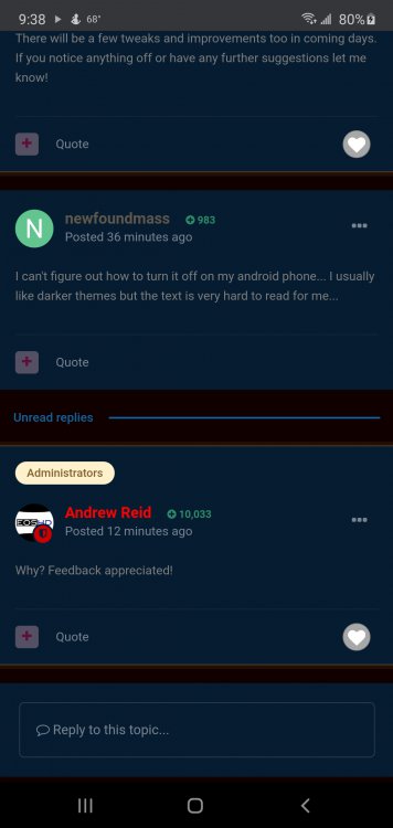 Figured out how to go to the light version, thank you Andrew! I don't mind dark themes, they're what I use on my phone, just the font color was too dark for me even after the tweak. I don't have the best eye sight, so it might just be me. I think Twitter in dark mode does a pretty good job. It's like an off white that they use... Easily to read but not too bright. Thank you for constantly trying to make the forum experience better!