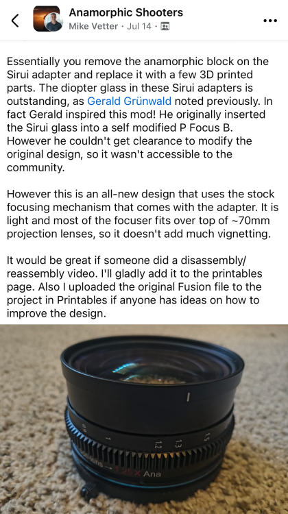 Thanks for sharing. I felt like this actually made a strong case for the Remus lenses! I found that look to be way more interesting. I'd still miss that 2x stretch though. You did a really nice job here. It's very closely matched! But I think it's the bokeh and the pincushion distortion that sells the effect for me. I think you've made a solid case to me for going with a more vanilla modern anamorphic lens (maybe a 1.8x) and dirtying it up in post. But at that price point, I think I'll rent on a project by project basis. The old school adapters are still inexpensive enough to own. I've discovered in my EOS-M that ML has a 1.175:1 aspect ratio available. With a 2x stretch, that's 2.35! It's very clean. Unfortunately the quality of the HDMI stream from this camera is pretty terrible and difficult to focus with, so I'll see if I can get the same thing from my 5Diii. Also, I spent way too much money ordering all of the parts for Lucas Pfaff's PFocus B anamorphic focuser with the hope that I could successfully assemble it and have a nice universal focuser for any cheap anamorphic adapter. However, I accidentally ordered it to be printed with 100% infill, so I fear that it's going to be a brick. But we'll see, maybe it will surprise me. If I did it again, I would only go this route if I had a 3D printer at home, or a friend who had one. From a cost standpoint, it doesn't make sense to order it from a site like Shapeways. @kyeHave you ever thought about purchasing a cheap 2x adapter? Given what I know of your aesthetic, I think you'd get pulled in!