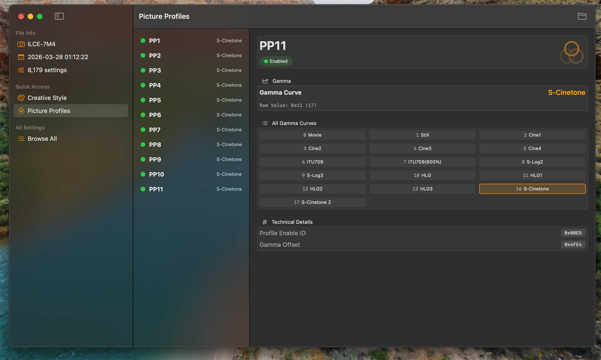 2. A may have, sort have, hacked my Sony a7 IV. Although the firmware is encrypted the .DAT cam settings file isn't. This allows you to dive in and change picture style parameters, without the limits of the camera menus or Sony's tethered apps via USB. This is early days yet, but I've already got a prototype app that's quite useful. First bonus feature... it allows you to save all your Picture Profile recipes and Creative Style settings to your laptop and manage them in a nice to use Mac OS app (Windows version I'll also be working on later). This allows you to store as many "Recipes" as you want and dial them into the camera. Second bonus feature... It is able to apply recipes to Sony raw files and export as LUTs for S-LOG2 and S-LOG3, with a live preview shot as you grade it. Interesting to see the reference to "S-Cinetone 2" in the data... Third bonus feature is that this app might allow us to go further in future... I'm getting a good understanding of how the camera OS works. I have also reverse engineered Canon's picture styles, although this is a topic for a future post 🙂