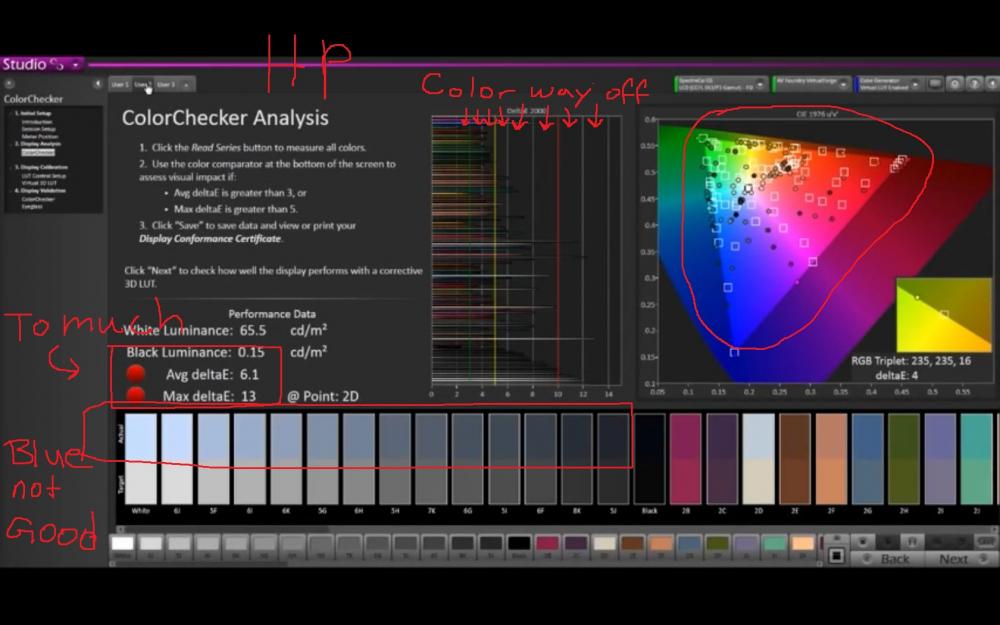 Hi guys there is much talk about camera gear but what i don't hear is monitor or what we use, which is as important or even more when it comes to final output. What i learned so far properly calibrated monitor is critical for color correction of our short films, music videos or what ever even for web. I know that dedicated color monitor are expensive ranging from $4000 like FSI monitors to Dolby PRM-4220 40 to 50k. I can be technology junkie and properly calibrated monitor is really important to me, i have Dell Ultra sharp u2410 10 bit ccfl for the past few days i have been trying to calibrate this monitor as close to REC 709 for HD and color correcting as possible and so far results have been really good you can only calibrate this monitor in standard mode since custom mode is broken and does not give you accurate colors, but problem with standard mode it does not give you access to RGB controls which is really important. There is way around this by accessing those controls via factory settings which is awesome. I have dispcalGUI and Argyll Color Management System which is free and i1 display pro from xrite. After calibrating to Rec 709 color space i was thinking is my monitor really calibrated or close to it. Answer is YES i used free trail of Calman Studio color checker Analysis to see if my monitor is calibrated properly to REC709 and to my surprise my colors measurement points in Delta E2000 chart are well below acceptable requirements in CIE1976 chart color looking triangle my premieres green, blue and red all fall in to that square which is a target for REC 709 if it is outside of triangle then its a problem also dots in side a square are color checker points and as you can see they all fall within the square or acceptable range The Green buttons in image My avg delta E is 1 where pro monitor is hitting 0.8 and my Max delta e is 1.9 where pro monitor is 1.7 I have provided 2 images one is my Dell calibrated and other one is LG flatron if you compare images you can see deltae2000 are way off and CIE1976 chart color is all over the place i have calibrated both monitor 4 times and result is the same dell monitor can be bought now for 300 dollars where i paid 600. Stay withing 24 inch because anything bigger color tend to shift since there is more real estate space Most of the pro monitors like FSI are 24 inch and below except Dolby PRM-4220 40 inch but at 40k you also get dolby technician to cone after 3000 hours to calibrate it which is not cheap Again i am not a pro but to me my colors specially in resolve color looks so good, blacks are black and not gray Thanks guys2 points