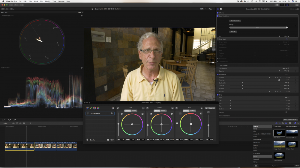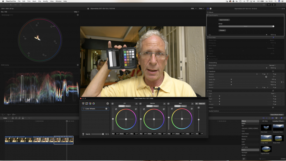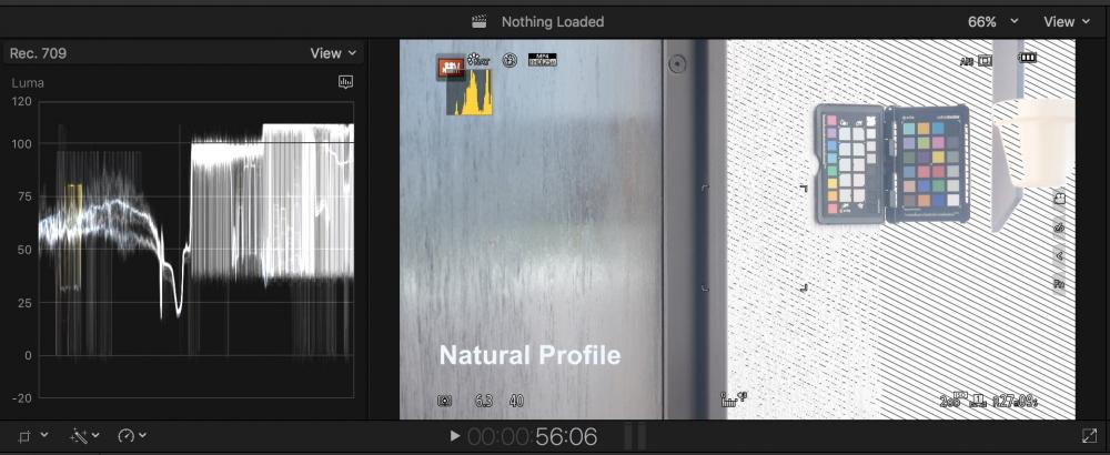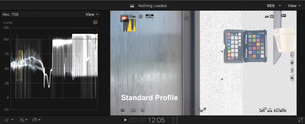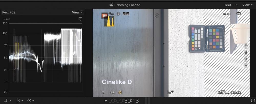 Just a slightly different aspect to this but I was curious about how accurate the zebras are and how useful the histogram is with these cameras so I did a little test with the G7. I set the zebras to 100 to flash the middle column where the colour checker is stuck on and framed it so the door was in shot to see the different shadow levels with different profiles. Ignore the completely deliberately blown out right third portion of wall and sky as this is for a completely different test ! So that you could see what the camera was actually doing (and more importantly what it was saying it was doing), I recorded the output with the overlays on into a Ninja Inferno and did 3 passes using Standard, Cinelike D and Natural profiles, altering the shutter speed to change the exposure to show where the zebras came on for each. Annoyingly, I can't record the scope overlays of the Ninja Inferno as it was interesting to monitor what the camera thought was 100 and what the Ninja Inferno did. The good news is that the zebras are pretty accurate (I checked at 80, 70 and 60 as well) and you can see that reflected in the scopes in these grabs in FCPX. You can also see that Cinelike D is reducing the peak and stretching other parts of the range compared to the same exposure using the different profiles (all profiles were set to 0 for every parameter so there is more to be had from tuning but that was outside of the scope if you pardon the pun of what I was doing. What I found interesting is how there was quite a coarse change in level between the exposure combination of ISO/SS and F stop that would trip the zebras and the closest one that wouldn't, with the level going from 100 to around 92-ish. Using a variable ND, I was able to slightly tune that between the cracks as it were to eek a bit more out but if you've got the precision to be turning an ND like that all the time then you'd be better off being a safe cracker. So, the takeaway for me from doing this is that the zebras are accurate enough to use at 100 if you want to really expose to the right and the histogram is, erm, a yellow graphic. Download link for the video file if anyone wants to have a look in their own NLE is here https://mega.nz/#!ZyYCgC6R!WTM3Nz2MXfSzKtwG0hPhOBAvSqNaOq4eOnIUycnPQ3I1 point