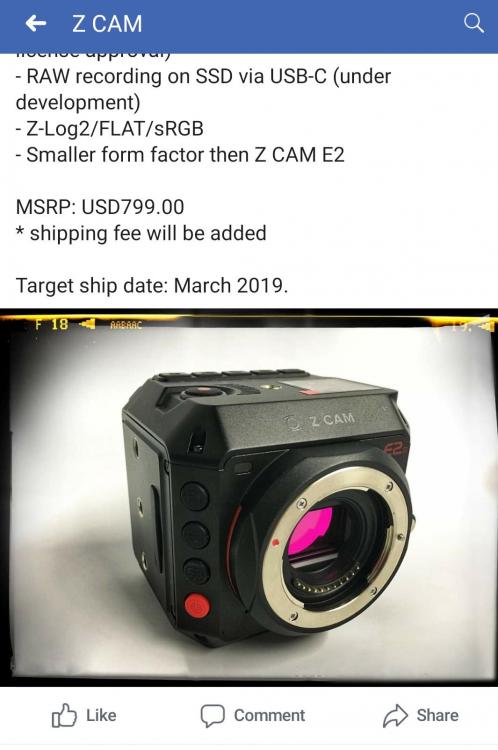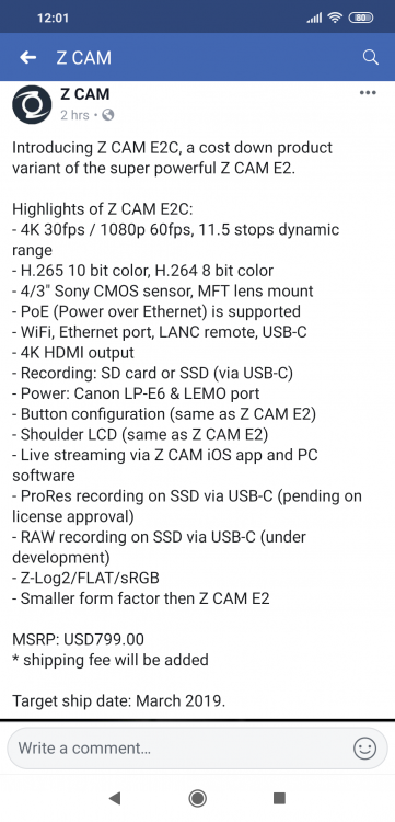 The E2C could be good. I wish they decided on 4K 60p or 1080p 120p but for $799 with ProRes and Raw out of the SSD/USB-C... I guess who can complain. Hopefully, the h.265 will be all-i at a decent bitrate.1 point -