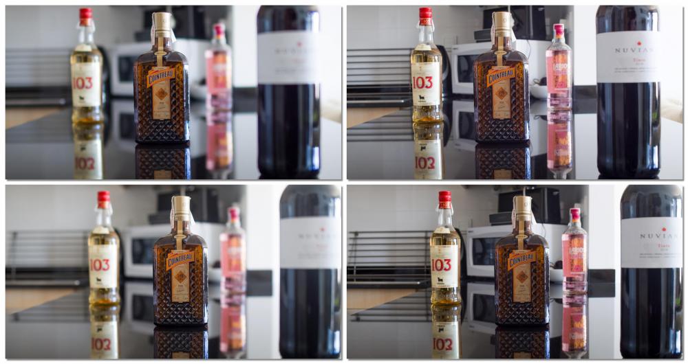 Right, its charts and bottles time again ! Haven't got a PL adapter for anything full frame at the moment so these are from RAW stills from the Blackmagic Pocket 4K. Same as the other test, so maximum aperture in the left frame and again at f5.6 in the right frame. Bit of a caveat as the RPP Prime is in T stops so I had to get it in the ballpark and then adjust exposure to match. Also the framing wasn't matched as its a different focal length but also due to having to mount the PL on rails but, hey, its a free test so I reserve the right to be a bit sloppy So, across the top we have the Samyang 24mm f1.4 and across the bottom the RPP Prime 25mm t1.8 Charts first. Then the same story with the bottles, with the focus set on the Cointreau bottle. CONCLUSION ? Less contrast on the RPP makes it look a bit smoother but we again we are quite a fair way from night and day differences. The Samyang though.....bargain.1 point