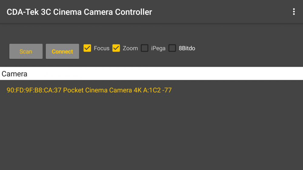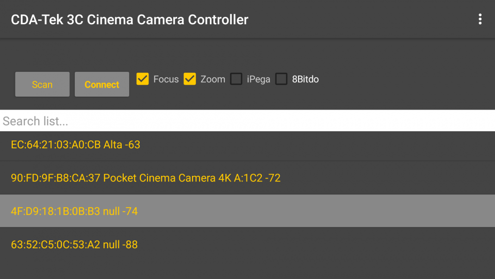 Here are the screenshots of it in action today in a city centre. First scan shows everyone's Fitbits etc as well as the camera. You now click on Search List and enter the filter term you want (I chose "Camera") And then it filters all of the other devices out. You could choose "4K" or whatever but I decided against a default in case people have renamed their cameras.2 points