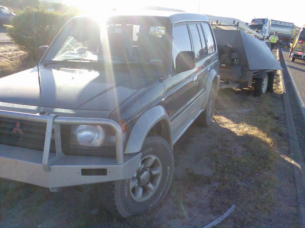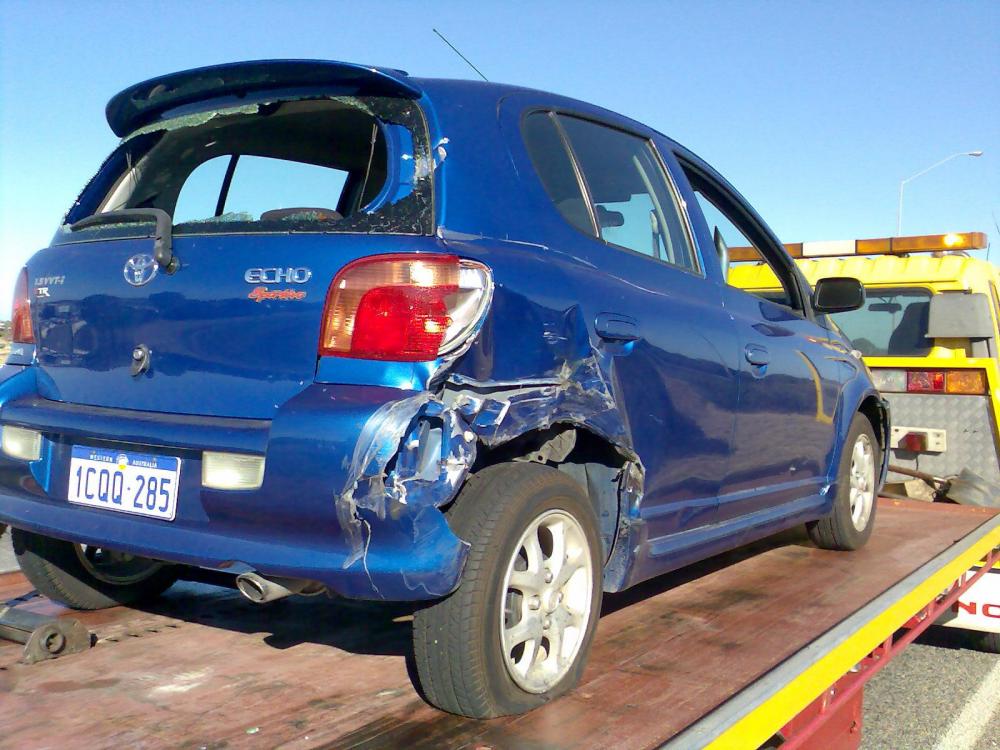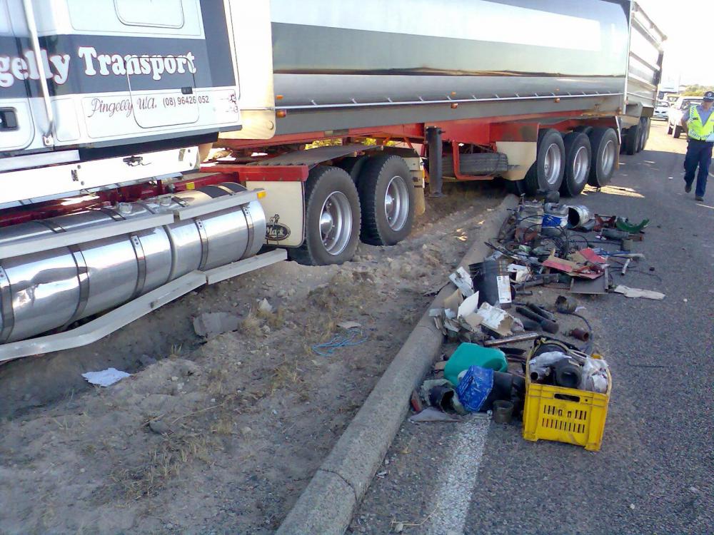 Accidents with semi-trailers? Check! This is how my previous car died... it was borderline write-off before they discovered the chassis was bent. Mine was the blue echo, and the 4wd with trailer went in-between my car and the semi. Traffic was almost stopped and the semi and I were next to each other and the 4wd comes flying up behind me, does an emergency lane change in-between me and the road train. His 4wd fit through the gap but the trailer didn't, and was what caused the damage to my car and the dent in the fuel tank of the semi. For an idea about how much faster he was going than we were, look at how far back the truck (and I) were from where he stopped. If he hadn't have emergency lane-changed I'd probably be living a very different lifestyle right now. It was amazing that no-one was really hurt, but we sure made a mess of the highway for a while!0 points