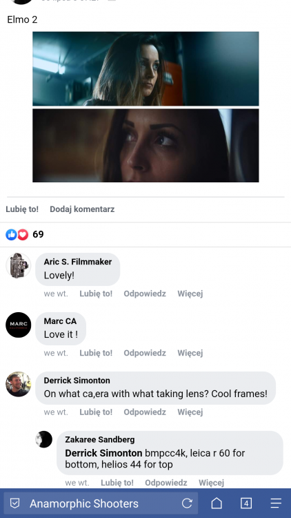 This one was shot with BMPCC4K, Helios 44 and Hypergonar S. T. O. P. https://m.facebook.com/story.php?story_fbid=381338402710980&id=196512047679611&refid=18&ref=content_filter&__tn__=*s-R Another one from BMPCC4K and Helios. This time Elmoscope II was used: Even though I'm not a big fan of Facebook groups, I have to admit that Anamorphic Shooters group (apart from everyday 'just showing how my gear looks like' posts) is a great source of knowledge and inspiration.1 point -
