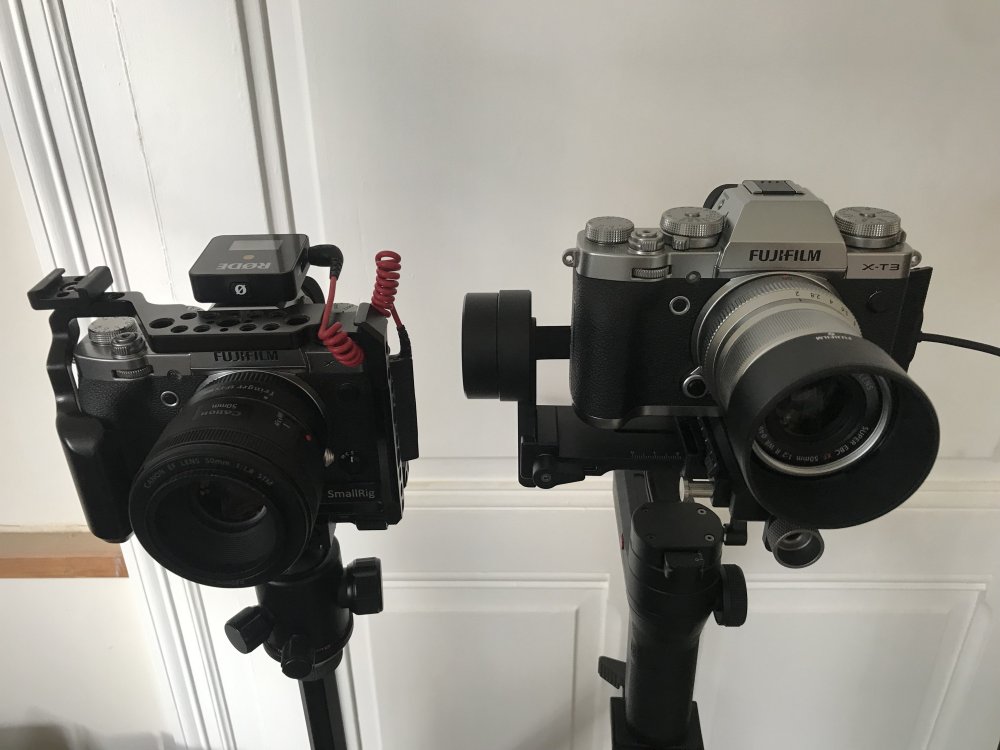 Pair of Fuji XT3’s for weddings. Left unit with Fringer Pro and choice of: Sigma 18-35 f1.8, Canon 50 f1.8 or Canon 85 f1.8 with Rode Wireless Go to transmitter with fluffy/lav/shotgun. On tripod. Ceremony, speeches and dancing only, ie, static. Right unit with Fuji 50 f2 and Zhiyun Weebill Lab on monopod with Anker battery pack. Moves with me throughout the entire day. I also have a Sony 1" camcorder on another tripod with shotgun as a ceremony & speeches back up, plus the OSMO Action for some B roll stuff plus Mavic Air.1 point