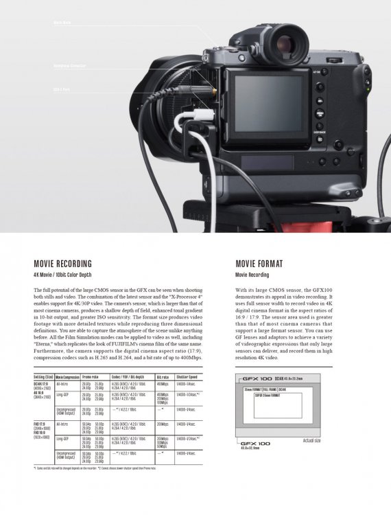 I picked up a GFX-100 last week ... returned it this week. The stills were unbelievably good ... better that I can describe. AF is a mixed bag in video ... AF-S unusable in that if you push AF on to move the point of focus in video the lens opens fully to focus then closes to the set aperture ... even in Manual mode. AF-C has a distinct shudder in the background at times when the camera hunts ... other times it looks good. My biggest concern for the camera ... I was shooting to an external recorder as ProRes HQ in 10Bit 4:2:2 in FLog .... the color balance had a magenta tint in spite of custom white balance and white bal correction with a Video Passport Checker in Davinci Resolve. The Fuji LUTS made it worse ... skin tones really pink ... not tanned .... I tried a bunch of other LUTS ... moved to ACES ... and rendered the same 20 minute video 5 times ... the last without a LUT and a bunch of RGB individual curve corrections. Skin tones correct but the background bordering on cyan ... pick one or the other as I was not willing to mask each of 4 persons in the video. Ten to twelve hours for something that normally takes me 2 hours. If I were not shooting interviews and just outside ... might have not been an issue ... as the landscapes I tested looked good. No crop in 4K DCI Full Sensor read ... UHD probably trims the sides. Very robust build ... so close.1 point