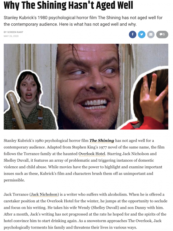 The school lesson for today kids, is: 1. Jack by all means MUST apologise in a lengthy monologue at the end, brush the ice from his hair and making clear that in no way is he morally right to come after his wife with an axe. 2. The "problematic and triggering" child abuse must be balanced by an extra 30 minute scene inserted into the middle of the director's cut, where Danny has counselling. 3. Rather than Shelly brushing all this off as a bad day at the office for Jack, she should immediately leave the hotel at the beginning of the movie and bring Danny with her. I think the film would be improved immeasurably for contemporary audiences with just 3 simple changes.1 point