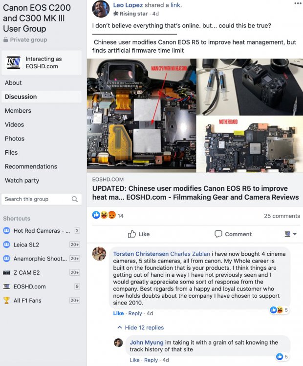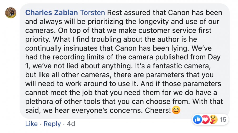 Found somebody who needs a good dose of truth. Let's set the record straight with this Canon rep as customers. https://www.facebook.com/groups/1327837727266187/permalink/3065603700156239/?hc_location=ufi The post permalink is only visible once you join the group. Please be polite. I was a bit edgy and they banned me immediately. The Canon rep who needs convincing is Charles Zablan in reply to the Torsten Christensen comment on the link to the EOSHD blog post. I don't see much humility from him given that I just paid 4380 euros for a duffer. I've put the screen grab below so you can find it in case permalink doesn't work properly.1 point -