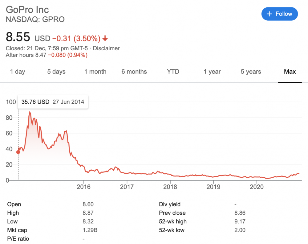 So, to paraphrase... In March, GoPro stocks were down to 3% of their 2014 peak But they've gone up from 3% to 10% of their peak The rise was unexpected In a conversation about a companies business model, where that business model hasn't really changed in the entire lifetime of the company, I would suggest that "down by 90% since 2014" is a more relevant figure than what they did in the last quarter, month, quarter-of-an-hour, etc... It's relatively easy to select any time portion you like to prove a point. For example, in the last few days they lost over 8% of their value. At that rate I guess they'll be bankrupt by the new year. Unless, of course, you think I'm taking the most current data out of context and I should zoom out a bit? 🙂1 point