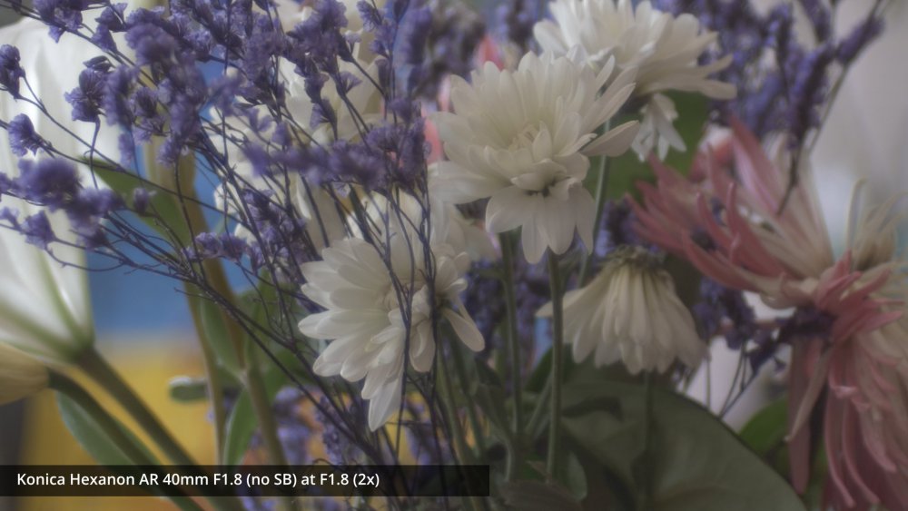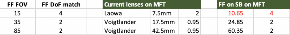 I've been digesting these images for a while now, and in previous tests it's always been the Cosmicar (Pentax) and the Helios that stood out the most, but I must admit that the Meyer 50/1.8 has really attracted my eye. It's very new (to me!) and this is the first test I've included it in and I must say it really holds its own.. I also like the Tokina RMC zoom. Of course, it has a couple of stops of advantage over the F2 lenses, but I bought it as a walk-around lens for the GX85 (44-100mm equivalent) and I'm really happy with it for this purpose. I'm yet to use it for real, but the images from it are great. The Takumar 55/1.8 is a funny lens. I've owned it a long time and tested it before and it has a particular rendering.. I wouldn't call it "painterly" but it's definitely *something*... but it's 2D as hell. Despite the fast aperture and blurring the backgrounds well, the images just lack depth. I found that in previous tests with all my Takumars. Great to see you back! 🙂 I must say that I thought the Voigts were too soft wide open for me, but I've since developed and explored my tastes, and found that this isn't really the case any more. What I haven't shown here is that you can sharpen them up a bit and adjust the magenta hue and the wide-open images fit much better with those stopped down. Lenses are a funny thing, and I definitely agree that it's up to us to enhance or minimise their character as we choose. That's definitely how cinematographers think of them - as spices to compliment the specifics of a project. What is interesting to me is that some of the things that cinematographers rely on lenses to do can easily be done in post, some other things can be done in post but require extreme effort, and other things are impossible in post. I once caused a borderline-argument between a guy from ILM and a senior colourist over this very topic - I asked what could be done in post to emulate a vintage lens look (just a generic one - nothing accurate) and the colourists were saying "nothing" and the ILM guy said that they do it all the time with compositing. I think the point of friction was the colourists (quite rightly) not wanting every client to read that and then expect miracles for free on every job. Fincher even shot Mindhunter on modern-looking lenses and added in the vintage effects in post: https://thefincheranalyst.com/2018/08/29/color-grading-netflixs-mindhunter/ There's a video somewhere of the colourist Eric Weidt stepping through his node trees in Baselight that was fascinating. You're right about the Aperture DoF equivalents... I forgot that the DoF emulations take into account the camera you select and I'd omitted that in my comparisons. I had seen that discrepancy some time ago in other setting but hadn't explored further until now. The table should be: The red indicates that there isn't an 11mm FF rectilinear lens (or one that I could afford anyway!) so I'd keep the Laowa 7.5mm F2 lens on MFT until I went to FF. I actually stopped using it because it wasn't sharp - wide-open at least. I have two copies and neither is good wide open. Here are the 2X crops - you'll see that it doesn't compare well with other lenses. Maybe stopped down it's sharp, but what's the point of buying a fast lens if you can't use the first few stops? Not as sharp as...... The Konica has a reputation online as being one of the sharpest lenses ever made. I'm not sure where that comes from really. Nope.. both are "Super-Takumar". I haven't compared the various coatings of different Takumars, but I suspect that it's like all things on the internet where there will be a few percent difference between them and the best ones sell for 5x the price, despite only being 4% better...1 point -