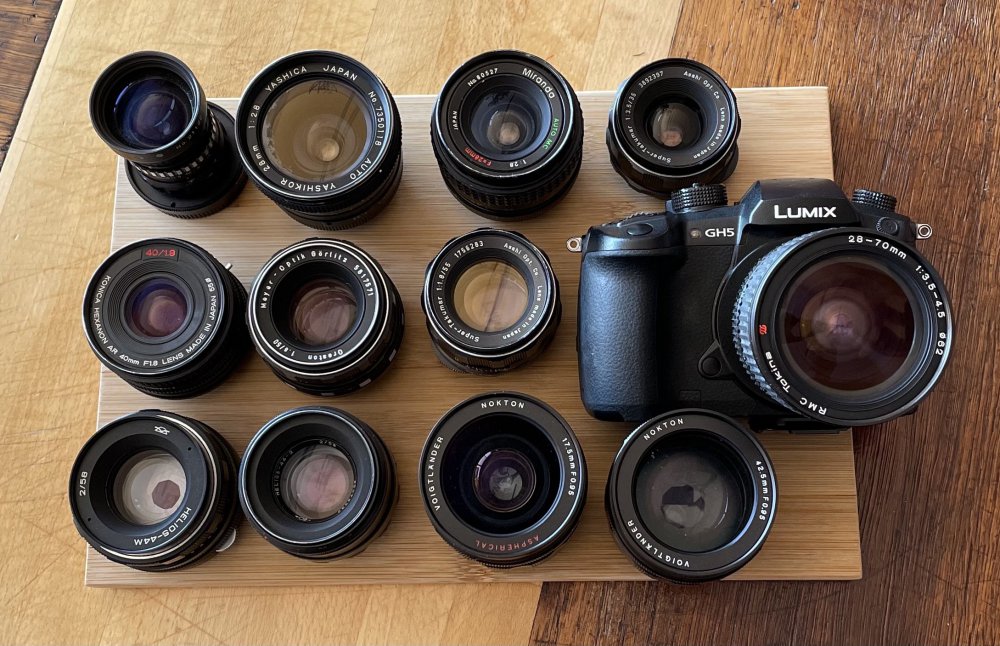 I'm contemplating investing in a vintage lens set, maybe FDs, maybe Rokkors, maybe something else, but figured I'd take stock of what I have and see what I can see. First I'll post the images in case they're of interest to anyone, then digest them in future posts. Test was GH5 in 400Mbps 4K ALL-I mode, Cine-D, Daylight WB, put onto a 1080p timeline. I tested all lenses wide open (typically around F2) and at F5.6 (all lenses were closed down some by then). I also did a 2X punch-in for each lens, because I like to use the 2X digital zoom function to grab quick shots, which also functions as a proxy for shooting 4K (although that doesn't matter so much unless you're doing VFX). Test setup had some depth, some glare, some sharp detail in the background, but nothing too outrageous.. Lenses..1 point