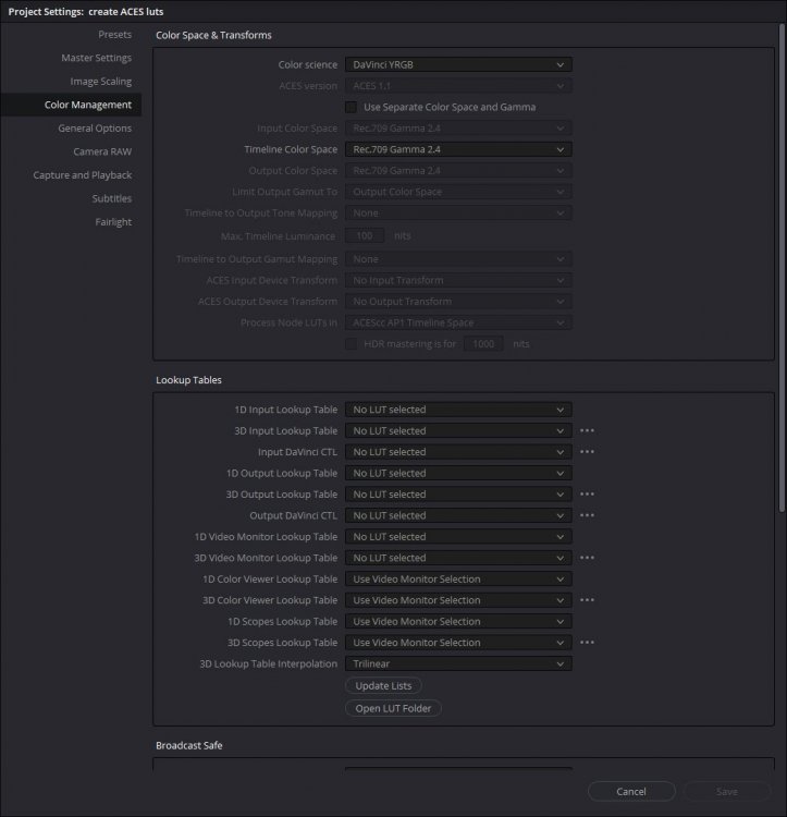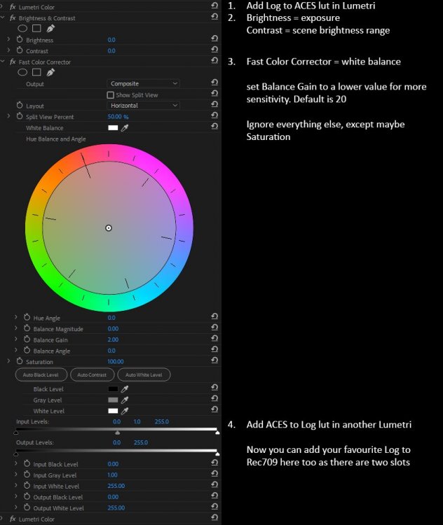 I've long been a fan of 10bit log because of how far it can be pushed without falling apart. However, I still use Premiere for all of my jobs. This is because I'm used to it, have old projects that I often need to incorporate in new ones and sometimes I need to be able to talk nicely to After Effects and Photoshop. I don't mind editing in it. But colour correction sucks for log footage. The Lumetri controls are designed to work on God knows what gamma. It's OK-ish for making luminance adjustments to log gammas (still not by any means perfect) but trying to white balance accurately is basically impossible. The highlights will be over corrected and the shadows undercorrected. For a while, for critical colour work I had been pasting Premiere timelines into After Effects in order to use an ACES worfklow there using the OpenColorIO plugin. The advantage of working in ACES space is that you can adjust exposure, contrast and colour globally across the luminance range. If you're used to using the White Balance, Exposure and Contrast sliders in Lightroom for photo editing then basically you can do the same thing very easily in ACES colour space. Finally, and thanks in part to a post on the Sigma FP thread I've found a way to do something similar in Premiere. Here's how to do it. You'll need a free copy of Resolve for this. Create a Resolve project with these settings and add a clip: Add Color Space Transform effect to a node and set the input to the gamut and gamma of your log footage. Then right click the CLIP thumbnail and generate a 3D lut (65 point). This lut will transform your log footage into an ACES-like condition: Now add a second node and add a Color Space Transform effect. This time the color spaces and gammas are reversed. This gets your footage back to log. Our corrections will go between these two transformations. Disable the first node (or delete it) and generate a second lut: Now in Premiere add the following effects: The first lut, Log to ACES, goes in the first instance of Lumetri (you'll have to find it in the Effects Panel and drag it to the clip. Don't go into the Color workspace as we'll need two instance of Lumetri) The second lut is ACES to Log and that goes in the second instance of Lumetri (if you put this in the Basic lut slot you can put a log to Rec709 in the Creative lut slot) Between the two add brightness and contrast. +15 brightness units is one stop. Also add the obsolete Fast Color Corrector. This simple colour wheel will do all your white balancing for you. There's even a white balance dropper if you need it. The wheel is very sensitive, though, so I lower the Balance Gain to 2 to make it less sensitive. If you have a nice lut that you like for your log footage then this is all you need to colour correct very, very quickly in Premiere. White balance, exposure, contrast. Done! Next! I'll post some examples of saving poorly exposed and white balanced shots when I have time. Premiere stupidly doesn't allow you to save the four effects as a single preset, but you can save the first lumetri as a preset, the two middle effects as a preset, and the last lumetri as a preset. I would love to not use Lumetri at all for this, but can't find a simple "Apply Color LUT" effect like there is in After Effects. Does anyone know of one?2 points -
