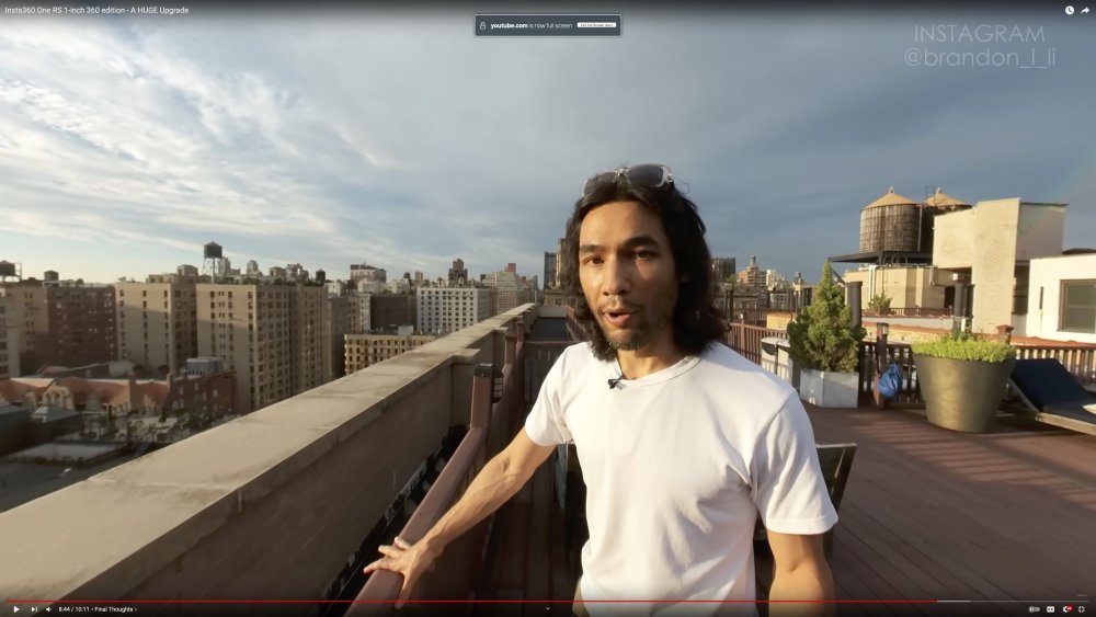 Oh, don't get me wrong, a 360 camera is a spectacular tool for capturing moments that cannot be predicted. I want one and would use it extensively, except that the quality just doesn't justify it. For me, my experience of shooting is a combination of how good the equipment is and the results I will get from it. The GH5 is a reliable camera with easy-to-use functions that creates a great image (when paired with the right lenses) and it's a pleasure to use, but it cannot guarantee that I will capture the right framing while I am recording, and it absolutely cannot give me two (or more) camera angles from the same moment in time. A 360 camera can give me every camera angle simultaneously. If I am walking down a street I am recording everyone doing everything at every moment. If I was to walk down a street and exchange greetings with a passerby or shop-keeper or turn a corner and see a wonderful view, I can capture the view looking forwards as well as the view of myself looking back. I can capture the person talking and the person listening and the reaction shots. I can capture it all. .......but at the quality that I will be capturing all of this footage, it would be demoralising. Walking around knowing you're capturing everything in "old budget smartphone" quality would just make me feel shitty. It's like going to a buffet and all the food is terrible but you can eat as much as you want. 360 cameras are capturing every shot at a quality that doesn't make me want to use any in my final video. I mean, look at this shot, from Brandon Lee (who is in the Insta360 promo video itself) in his paid sponsored video for it: and here's his face: With image quality like that, my experience is better to shoot with an action camera that is only capturing a quarter of the action in a scene, but the shots are all much nicer and I feel like I'm capturing usable footage. I mean, we have the P4K which was released in 2018 that wrote 1088Mbps to a card and now we have this camera at about 60% of the price and it's limited to 120Mbps. It's not the resolution that's the problem - it's the bitrate. This camera is more crippled than almost any Canon camera has ever been! It's sensor will be about smartphone quality, which if you look at the image that they're able to make when shooting RAW stills, you'll know that they're nothing like the above image quality, so it won't be the sensors - it's the processing and codec.2 points -