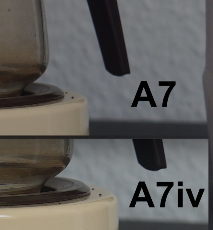 I've pulled out the switch section in each comparison to show that the focus point is slightly different within each test. In some it favours the A7 and in others the A7iv in terms of appearing sharper but at the actual focus point for each camera within each comparison image they are both much of a muchness. If you take the MD one for example, the switch is sharper on the A7 because the focus point is on that whereas with the A7iv it looks softer but if you then compare the rim of the jug in each you'll see that it is reversed as that is the focus point for the A7iv.1 point -