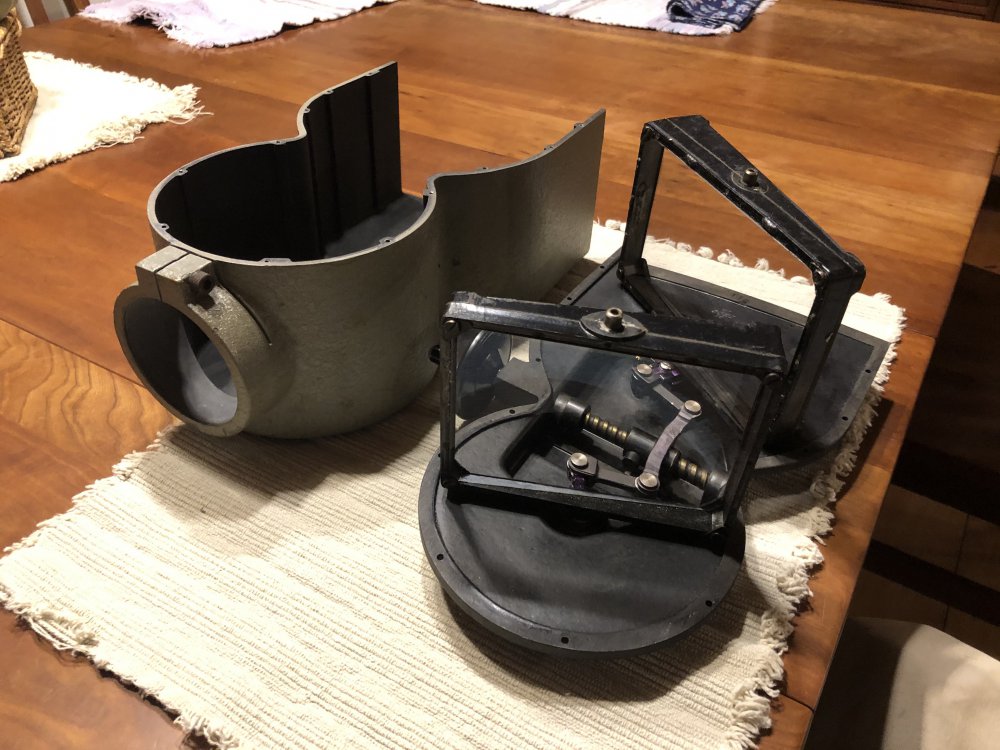 This is a Superscope, an RKO prism anamorphic from the mid-1950s when many systems flashed in the pan of development. There’s something really satisfying about actually snagging TWO of these for $150, and having them show up in their original boxes complete with Superscope red font box tape, and a manual still in the envelope it was originally mailed out in, post-stamped from my home state of Minnesota. Based on the pictures, I was rather worried about fungus, but they opened up easily, and are cleaning up to look brand new, a new coat of crinkle paint being the only needed exception. According to the manual, they’re good from 75mm and up (on 35mm), and can vary squeeze from 1X to 3X. There’s an additional micro adjustment screw for dialing in even squeeze across the image. Seeing as these have no focus control, I’m interested to test wether they can handle focus through, and perhaps sacrifice one as an optics donor for a more camera-friendly re-house. If all else fails, they’re quite stunning as-is, and a slice of cinema history for the bookshelf. If anyone has experience with prism anamorphics, please chime in!
