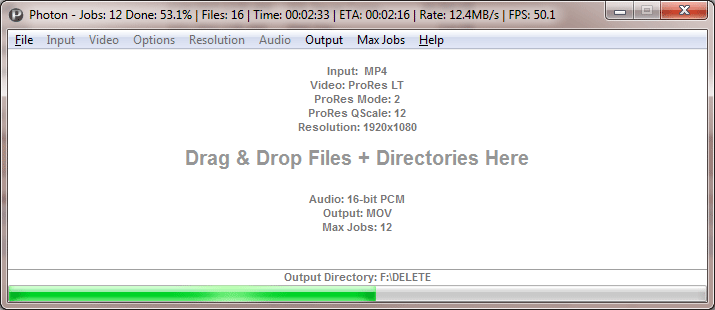 Thanks guys! Currently Windows only, though would expect it to work OK with Wine or any VM on OSX. Might port the project to wxWidgets which would allow an easy OSX port. Photon was designed to the be the fastest transcoder of those using ffmpeg: please let me know if any transcoder is faster. Testing with 12 (or more) NX1 4K H.265 files with the following ProRes settings yields 50fps (4K => 1080p with very high quality scaler): NX1 H.265 4K to ProRes LT 4K = 33.1fps: This is on a 5+ year old MacPro: would be helpful to know performance numbers on other machines.