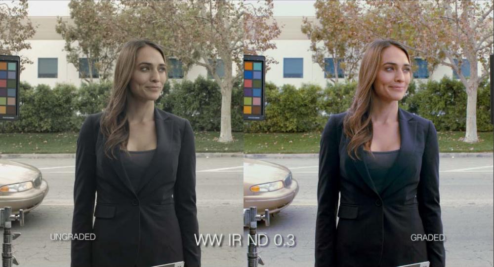 toxotis70- http://www.4kshooters.net/2014/11/14/crazy-un-scientific-fatal-four-way-shootout-canon-5d-mark-iii-vs-gh4-vs-sony-a7s-vs-canon-eos-c100/ , https://vimeo.com/72566458. There's more out there... Tim- that's the pattern I found with lots of research too. Alexa > Dragon/Epic > F55. Here Shane tests the Blackmagic URSA: http://www.hurlbutvisuals.com/blog/2014/12/blackmagic-4k-ursa-tests-part-1/. In the IR tests, actress Eli Jane's skin tones look good, however the background sky, specular highlights, and the white lines in the parking lot are all too magenta: A quick try at fixing the background while preserving the skin tones: Interestingly, while the skin tones changed (global changes: didn't use any masking), they look more natural for the lighting conditions.