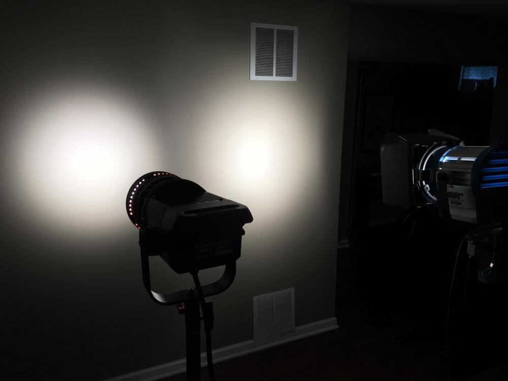 It's not covering 5 to 9 times more. Arri 650 flood beam is 55 degrees. The 120t is 120 degrees without any modifiers. This test I have a reflector cone wihich is shaping it to about 55 degrees. The only reason I used the barn doors was to show the line between the 2 clearly.