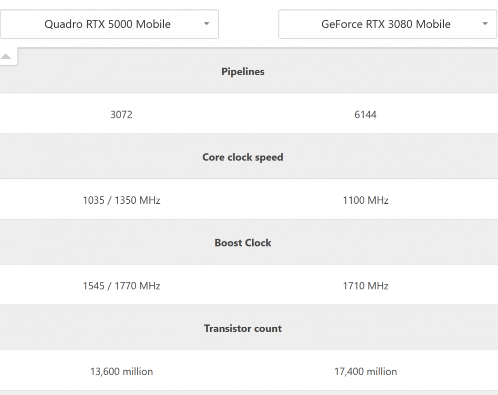 Interesting improvement as matter of fact putting the gaming graphics beyond the mobile workstation predecessor generation: https://technical.city/en/video/Quadro-RTX-5000-mobile-vs-GeForce-RTX-3080-mobile And you can already pre-order yours at that side too whatever size (15.6" or 17") you want: https://www.skikk.eu/en/laptops/15ds50 https://www.skikk.eu/en/laptops/17ds70 @ Max-Q version (but with 16GB VRAM anyway) : https://www.notebookcheck.net/GeForce-RTX-3080-Mobile-vs-GeForce-RTX-3080-Mobile_10586_10474.247598.0.html