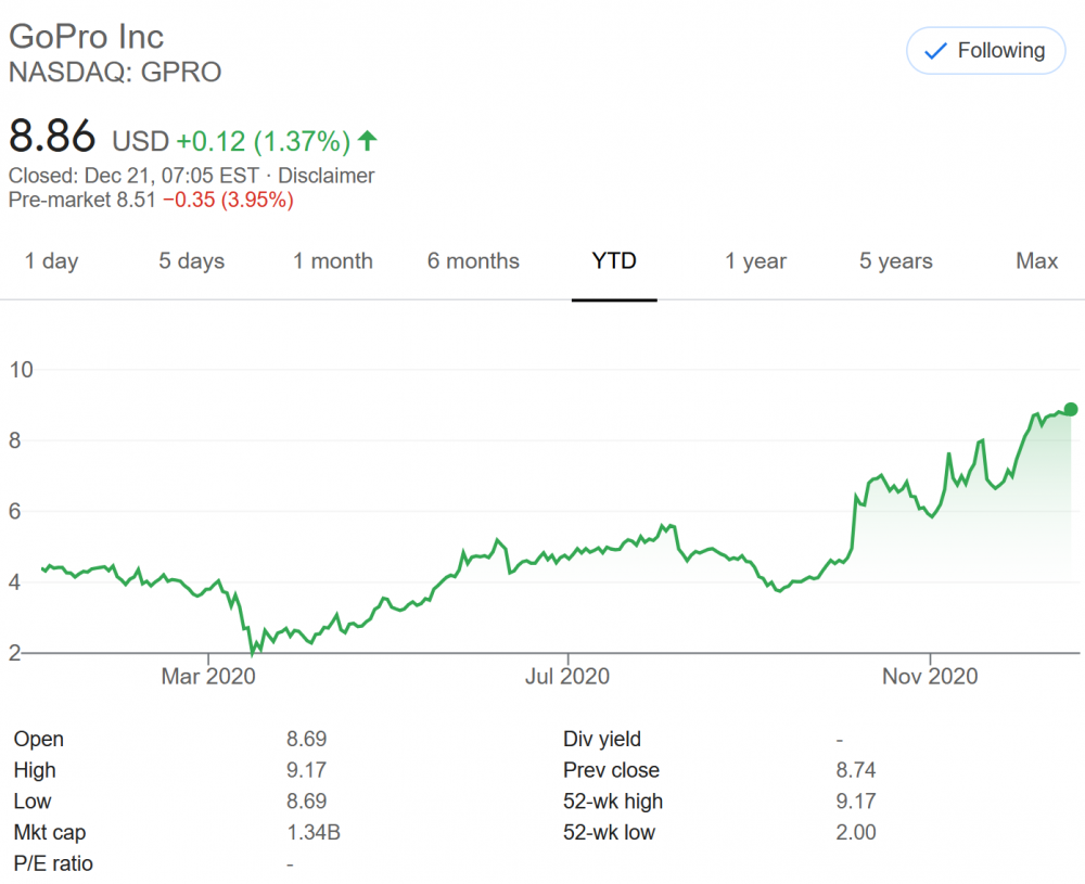 The things we learn in a cameras forum! : D Six years and a half charts are a new must-have... Wait, no, no, the importance of 52-Week High and Low charts five years ago... LOL ; ) https://www.barrons.com/articles/gopro-stock-soars-19-as-new-camera-drives-better-than-expected-profits-51604686232 GoPro shares are flying on Friday after the specialty video-camera company posted third-quarter financial results that were dramatically better than the company had previously projected. For the quarter, GoPro (ticker: GPRO) reported revenue of $281 million, up an impressive 114% from a year ago and up 109% from the previous quarter—and well ahead of the company’s forecast range of $220 million to $250 million. (Nov. 6, 2020)