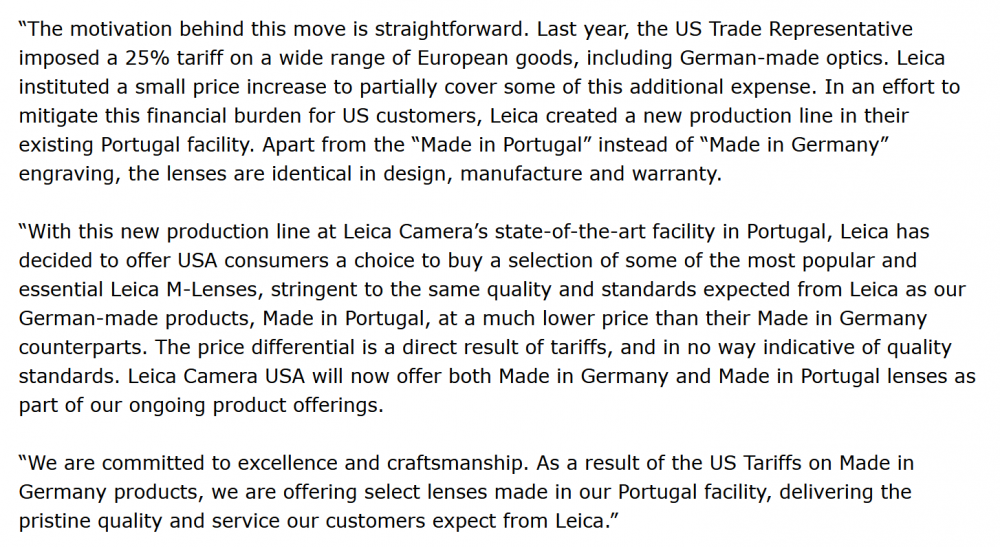 "With this new production line at Leica Camera’s state-of-the-art facility in Portugal, Leica has decided to offer USA consumers a choice to buy a selection of some of the most popular and essential Leica M-Lenses, stringent to the same quality and standards expected from Leica as our German-made products, Made in Portugal, at a much lower price than their Made in Germany counterparts. The price differential is a direct result of tariffs, and in no way indicative of quality standards." https://www.reddotforum.com/content/2020/08/leica-introduces-made-in-portugal-m-lenses-at-lower-pricing/ Made about 40-50kms / 25-30 miles away of where I am while I am writing these lines here now... :- ) https://www.fdtimes.com/2017/02/22/leica-portugal-tour/ http://www.fdtimes.com/wp-content/uploads/2017/02/80FDTimes-LEICA-PortugalFactoryTour.pdf