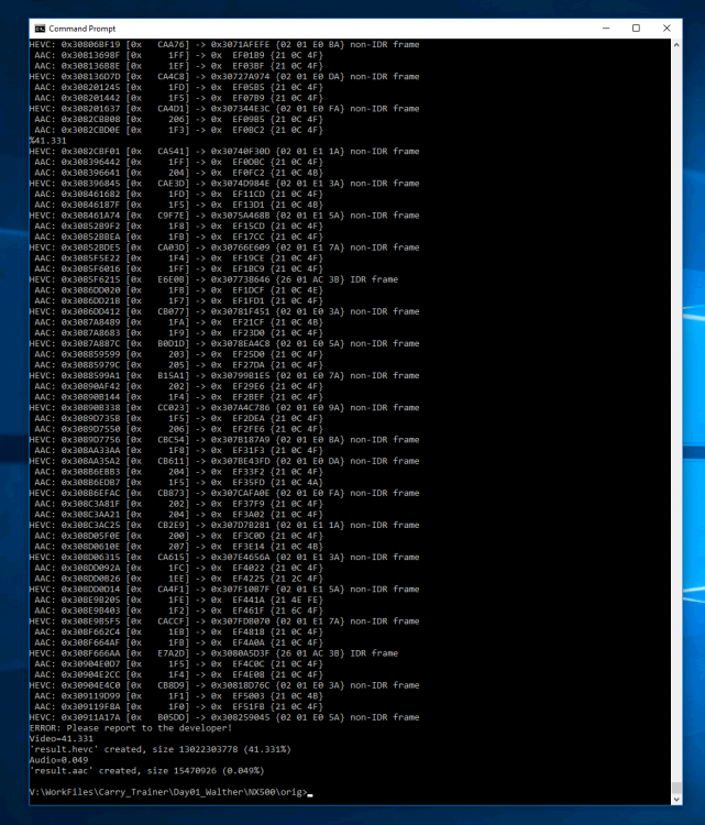 Thanks Kisaha, I am trying the tool you linked above and it seems to be working. I've got a 30GB file from my NX500 I'm running recover on now... I'm not sure if it's normal, but my stream recover operation is slowing way down at the 41.331% mark. I'll let it run over-night if I need to. I'll let you know how things go when I get to step #3 with ffmpeg. I was hoping I might be able to load the stream files directly into Sony Vegas or After Effects to trans-code. I've played AAC audio files on my own before... ------------------------- Whoops... My recover just crashed. I'll pass this along to the developer. Hopefully, I can use the half of the stream it successfully pulled out.
