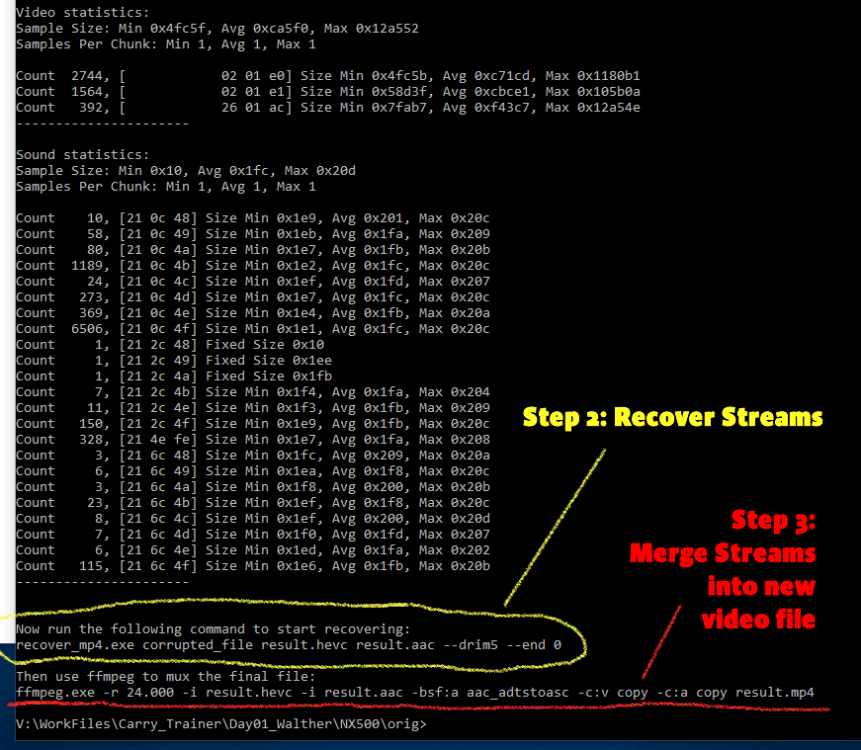 Ok, here's the final result. Using Dmitry Vasilyev's recover tool I was able to recover 42% of the bad video file... roughly 10 mins of a giant 30GB 4K file. At that point NX500 stopped recording good video frames. I'm happy with that... and now knowing how to salvage corrupt video files is awesome. As I encounter other bad video files, I'll write about that here in the future. If I have time in the future, I'll make a video tutorial walking people through the process. Remembering how to use a command prompt from my MS DOS days was the most challenging part. PS: That's Sang Lee from the Carry Trainer YouTube Channel. He's our regular Co-Host and Tactical Ninja.