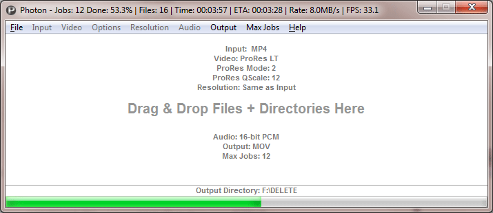 Tried some NX1 files (80mbps 4K) with the same settings on my i7 3770 (4 cores 8 threads), 16GB RAM. I'm getting about 6.0 MB/s and 16 FPS when converting 4 files at once (I can't set Max Jobs higher than 4). It makes sense your 12 core machine is faster, but how come you get dubble the fps but the data rate is not that much different? Does that depend on the source files? When using RockyMountain Movie Converter (4K ProRes LT) it says it's working with a bitrate of around 275000 kbps. This translates to around 35MB/s. The 4 files (46 seconds in total) take about 90 seconds to convert. With Photon the same job is done in 68 seconds. The resulting files from Photon are a lot smaller though (600MB vs 1,5 GB for RMMC) with those settings. Also just noticed that the files from Photon have less contrast - RMMC seems to clip the blacks and whites where Photon still shows detail. Interesting, because the RMMC file looks the same as the original file when played back, but this might be another playback issue with contrast/blacklevels...
