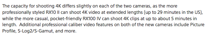 "The capacity for shooting 4K differs slightly on each of the two cameras, as the more professionally styled RX10 II can shoot 4K video at extended lengths (up to 29 minutes in the US), while the more casual, pocket-friendly RX100 IV can shoot 4K clips at up to about 5 minutes in length. Additional professional caliber video features on both of the new cameras include Picture Profile, S-Log2/S-Gamut, and more. " http://www.sony.com/en_us/SCA/company-news/press-releases/sony-electronics/2015/sonys-rx100-iv-and-rx10-ii-cameras-bring-professio.html Sony USA 29 minutes for the RX10 II in 4K.