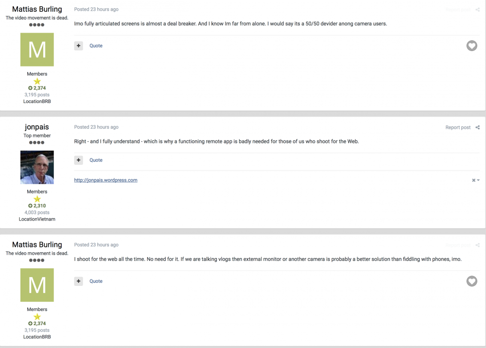 As you can see, I was perfectly willing to go along with @Mattias Burling regarding a fully articulating screen, but he must continue pressing on: In what way, shape or form would a remote app capable of 4K hinder someone from making videos? And can anyone explain to me how using an external monitor or another camera [sic] for vlogging is more convenient than using the remote app? "I don't care if it's there or not". Well, maybe @Mattias Burling doesn't, but lots of us do. I don't shoot 4K 60p or anamorphic either, but I'm not about to dictate to others what's important to them.