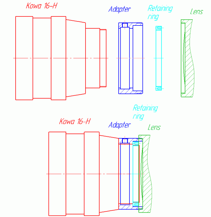 2. Hi everybody. I heard that Redstan stopped to manufacture these adapters, and just selling remaining stock at the moment. So, I suppose he'll not object copying of his design now. That is why we made first adapter of this type (M62 filter thread to Kowa-16H and others with 52mm rear diameter). Here is the link http://www.rafcamera.com/en/adapter-52mm-to-m62x0-75-rr Limited quantity is made to check demand. Our version of this adapter keeps 1.5mm distance between rear end of Kowa and front glass of taking lens. It is possible to get closer for my particular lens, but I suppose it may be unsafe for some other lenses, so our adapter allows Kowa rear end to go only 0.5mm besides front plane of a taking lens filter rim. Another feature is intermediate flat spring preventing damage of Kowa barrel by adapter tightening screws (3 of M5 screws are used). Current price is $45 + shipping. If you need some customized adapter, we are ready to make it (average time of availability since drawing is approved is 10 days). Thanks. Raf.