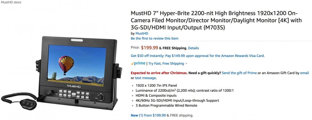 MustHD also offers a 2200 nit 7" monitor. The price seems to be as low as the Feelworld if you purchase from Ebay. I picked the HDMI only version for $199 on Amazon. They can currently be found on ebay for less than $250 for the HDMI only version. Things that I like about the MustHD is it is supposed to support 4K 60. It has a lot of buttons on the front to select with. Its' case is metal, which is supposed to help dissipate the heat generated from the high brightness output. It seems like a good alternate if 4k 60 is part of your work flow. I plan to try it on my GH5 - hopefully they will play nicely with each other. If Feelworld had 3D LUT support it would have been my first choice, but neither of these monitor support 3D LUTs as far as I am aware.