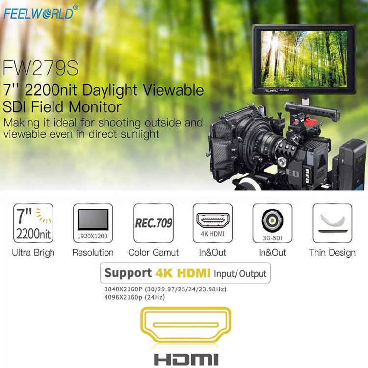 Currently, on sale at through Amazon there are 2 x $339 high bright 7" monitors with SDI, one by Feelworld, one by Portkeys. The Feelworld is 2200nits, The Portkey is 1200nit. both are daylight viewable. though the Feelworld should be almost twice as bright. The Portkeys is has 3DLUT support, the Feelworld does not. Both have SDI, 4k HDMI... and a host of additional features. If you need 3D LUT support then the PortKeys HS7T (current on sale through December 25th for $339) seems like a reasonable trade off if your camera does not have an HDMI or SDI output with a 3D LUT applied. I plan to use it with the Blackmagic Cinema Camera. https://www.amazon.com/PortKeys-HS7T-Bright-1200nit-Monitor/dp/B07GSPGDHH/ref=sr_1_8?s=electronics&ie=UTF8&qid=1545551040&sr=1-8&keywords=Portkeys The FEELWORLD FW279S might be a better choice if you don't need 3D LUTS https://www.amazon.com/dp/B07J4CPJ3R?aaxitk=HgWbenBv6YilQplNdIhNyw&pd_rd_i=B07J4CPJ3R&pf_rd_p=3ff6092e-8451-438b-8278-7e94064b4d42&hsa_cr_id=8430460080401&sb-ci-n=productDescription&sb-ci-v=FEELWORLD FW279S 7 Inch 4K HDMI 3G-SDI 2200nit Daylight Viewable 1920x1200 On-Camera Field Monitor with Histogram%2C Focus Assist%2C Zebra Exposure%2C False Color%2C Check Field%2C Pixel to Pixel for DSLR Camer Also worth mentioning the Must HD M703S at $449 with says it supports 4k 60Hz in case it goes on deeper discount in the future. https://www.amazon.com/MustHD-Hyper-Brite-Brightness-1920x1200-Loop-Through/dp/B071412MSF/ref=sr_1_1?ie=UTF8&qid=1545552813&sr=8-1&keywords=musthd+m703s