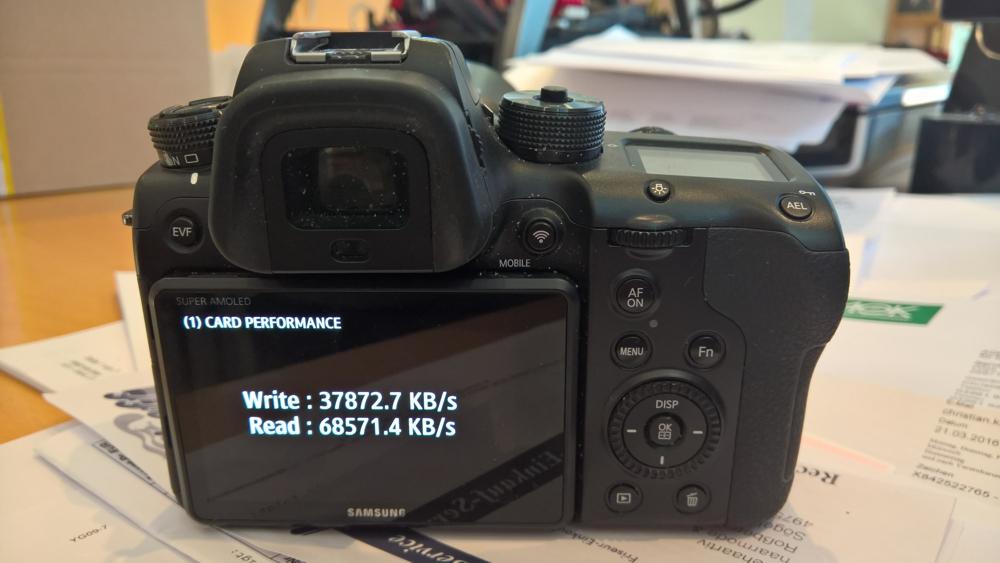 I thought that we could make a Database here: Samsung NX1: 68.374 KB/s Lexar SDXC 64 GB UHS-II U3 / Class 10 50.740 KB/s ScanDisk SDHC 8 GB UHS-I / Class 10 44.328 KB/s Samsung Pro SDXC 64GB UHS-I 37.873 KB/s Transcend SDXC 64 GB UHS-I U3 37.347 KB/s ScanDisk SDHC 8 GB UHS-I 36.186 KB/s Samsung Pro microSDHC 16GB UHS-I 18.217 KB/s Transcend SDHC 32 GB Class 10 16.616 KB/s ADATA SDHC 32 GB Class 6 12.772 KB/s ScanDisk Ultra microSDHC 16 GB Class 10 3.735 KB/s Transcend SDHC 4 GB Class 4 xy xy Only Write-speed, only Samsung-inCam testet (for NX500 i will make a second chart here) Please write your results here and I will log it