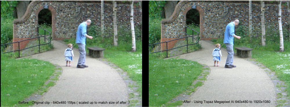 A couple of days ago, I down-loaded the beta version of Topaz Megapixel AI to my PC ( Windows 10 , i7, 16GB ram, GTX650 Ti graphics card with 2GB memory ) It is free for a 30 day trial. I tried some sample clips - process was painfully slow. To render a clip 1080 30p which was 1 minute long was going to take 7.5 hours. I have some clips made 12 years ago of my grandchildren. 640x480 15fps . I have managed to up-scale these to 1920x1080 30fps in Resolve 15 and get improvements The stabilizer seems to reduce jerky effect of 15 fps and produce something which is better to view. I wondered what the Topaz Megapixel AI would do when using it to up-scale from 640x480 to 1920x1080. I tried it on a clip 2 seconds long to reduce render time. It did 'improve' the image quality to some extent. I compared a before and after image of a single frame. I also tried it on some 1920x1080 30fps clips converting them to 4K. I compared before and after a still frame but couldn't see any difference.