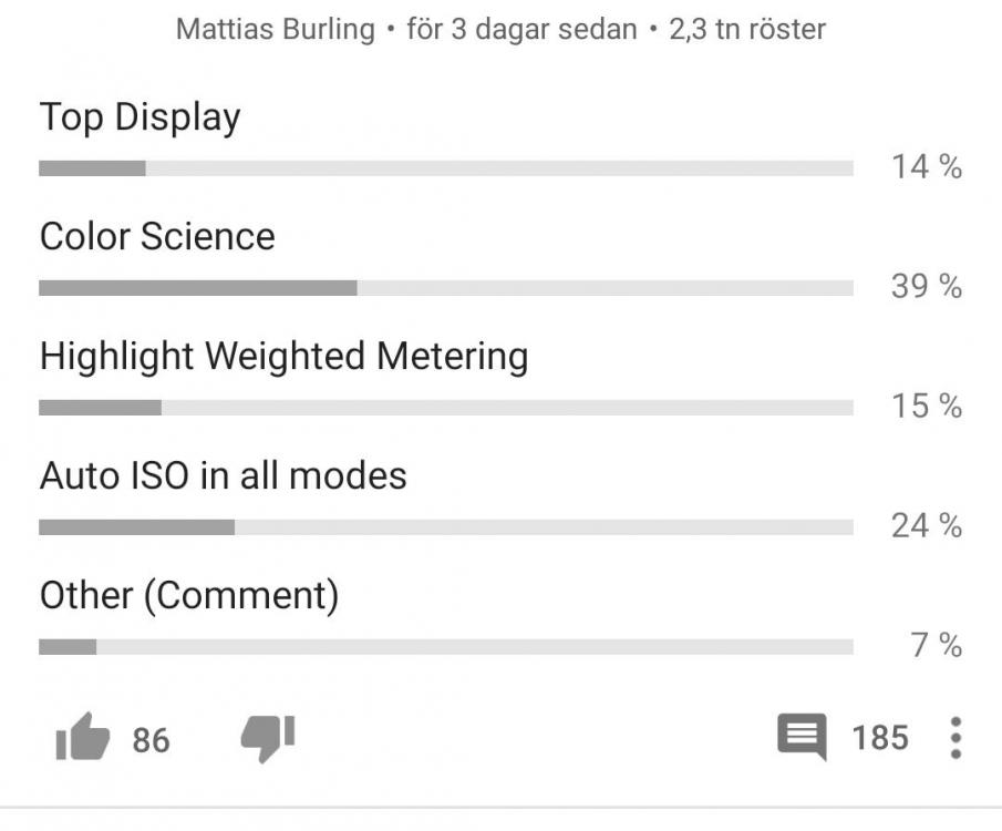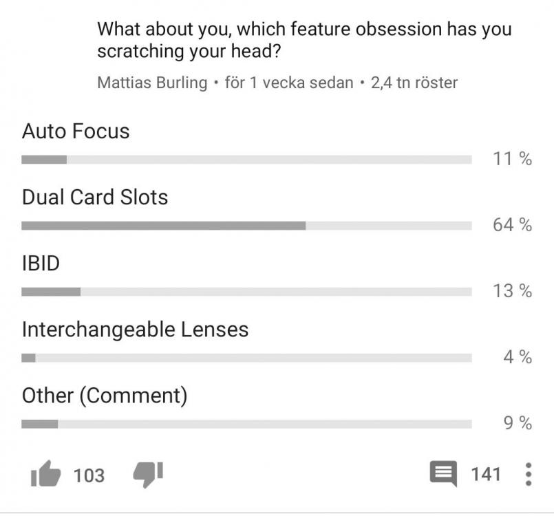 I made a poll asking about Underrated Camera Features. 39% out of 2300 votes went to color science. I also did one for Overrated Features with 64% out of 2400 votes going for Dual Card Slots. *It's supposed to say IBIS but unfortunately YouTube doesn't allow editing of polls. -