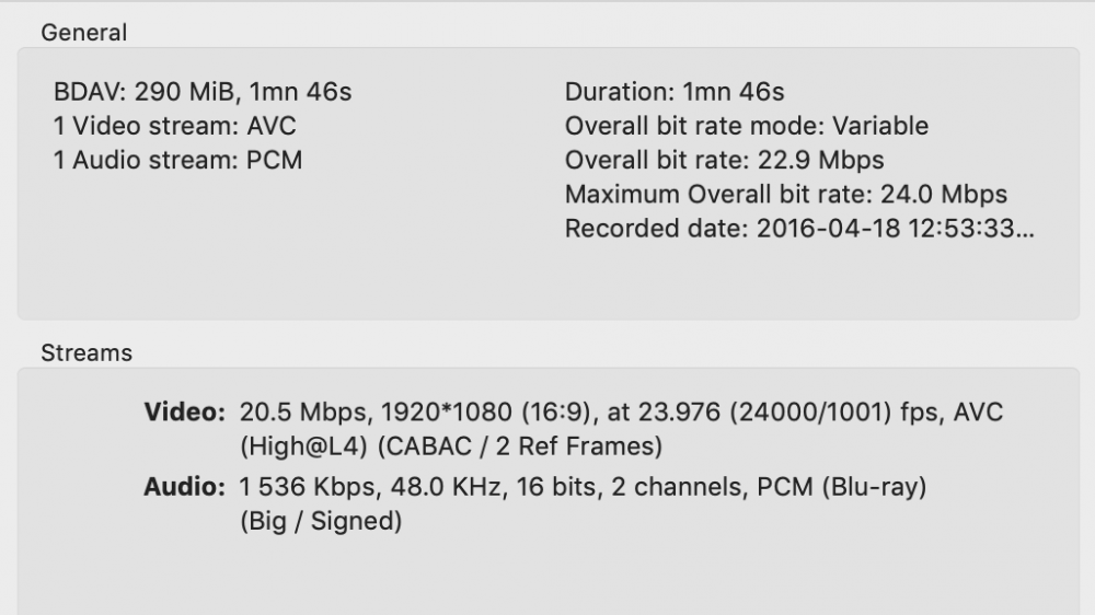 I mounted the original storage hard drive, and Media Info also indicates that the files are 23.976fps. I posted the attachment. The C100 menu did not have a shutter speed that I could select that was below 1/24. I'm almost positive I chose 1/34 because the others (1/24, 1/30, 1/40 were causing flicker. I was shooting in a PAL region but the camera was set to NTSC. I have other files from the same location that are shot at 23.976 1/48 and are just fine.