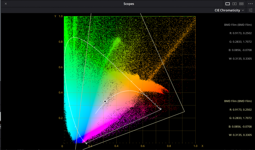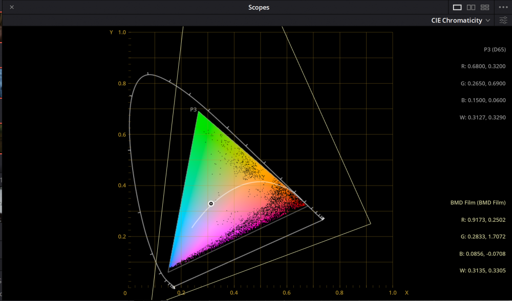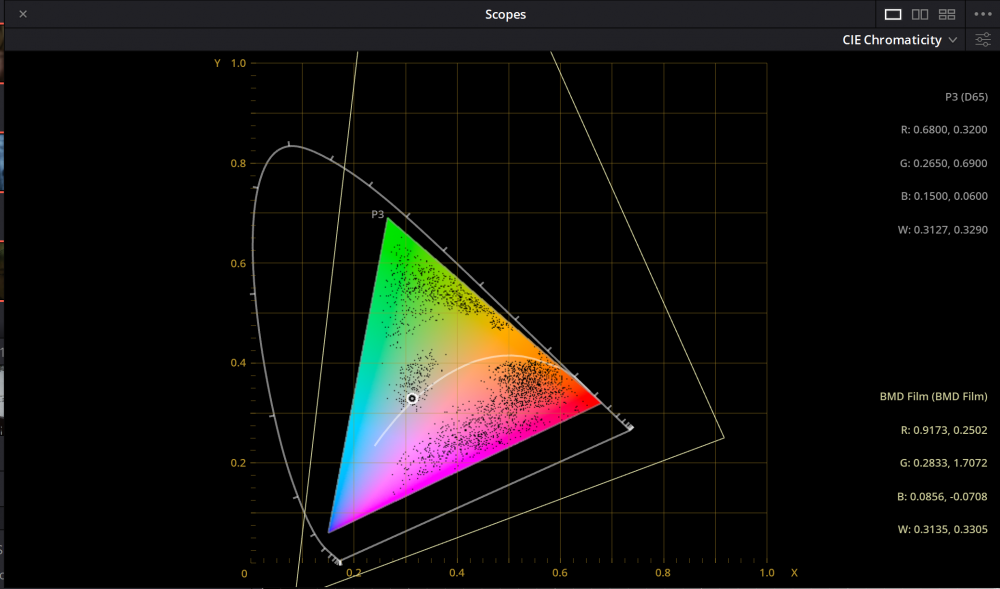 Thanks for Clarifying officially! If you actually do this then the settings are Color Space: Blackmagic Design, Gamma: Blackmagic Design Film. The gamma curve brings all the range in and the colourspace is BMD. What does that actually mean though, you say that it won't touch gamut? To try and understand i use the CIE diagram scope. And setting the DNG to P3 vs BMD Film 1 (in a P3 timeline) i see the first two diagrams. First is BMD Film into a P3 Timeline and the second is debayering P3 into a P3 timeline. Now this is basically a point of confusion in Resolve for me - to understand what resolve is actually doing in this case. A saturated Red in sensor space in the DNG is transformed into 709/P3/BMD Film - but is that saturated Red actually mapped into the target space or is it placed at the right point. I cannot work it out. So for example if that sensor Red is outside of 709 space then IMHO Resolve could either clip the values or remap them. But if you switched to P3 and that Red lay within it then no mapping has to happen. But on the CIE diagram i do not see this. I would expect to switch between 709 and P3 and the colours inside the triangles not move. In other words in a sufficiently large colourspace on that CIE diagram i ought to be able to see what the camera space is (ish). So when i do this and choose BMD Film and set the timeline to that as well i get the 3rd diagram - which is beyond visible colours so i have to assume i just don't understand what Resolve is doing here or that CIE diagram is not working? Any light shed (pun intended) would be super nice! cheers Paul -