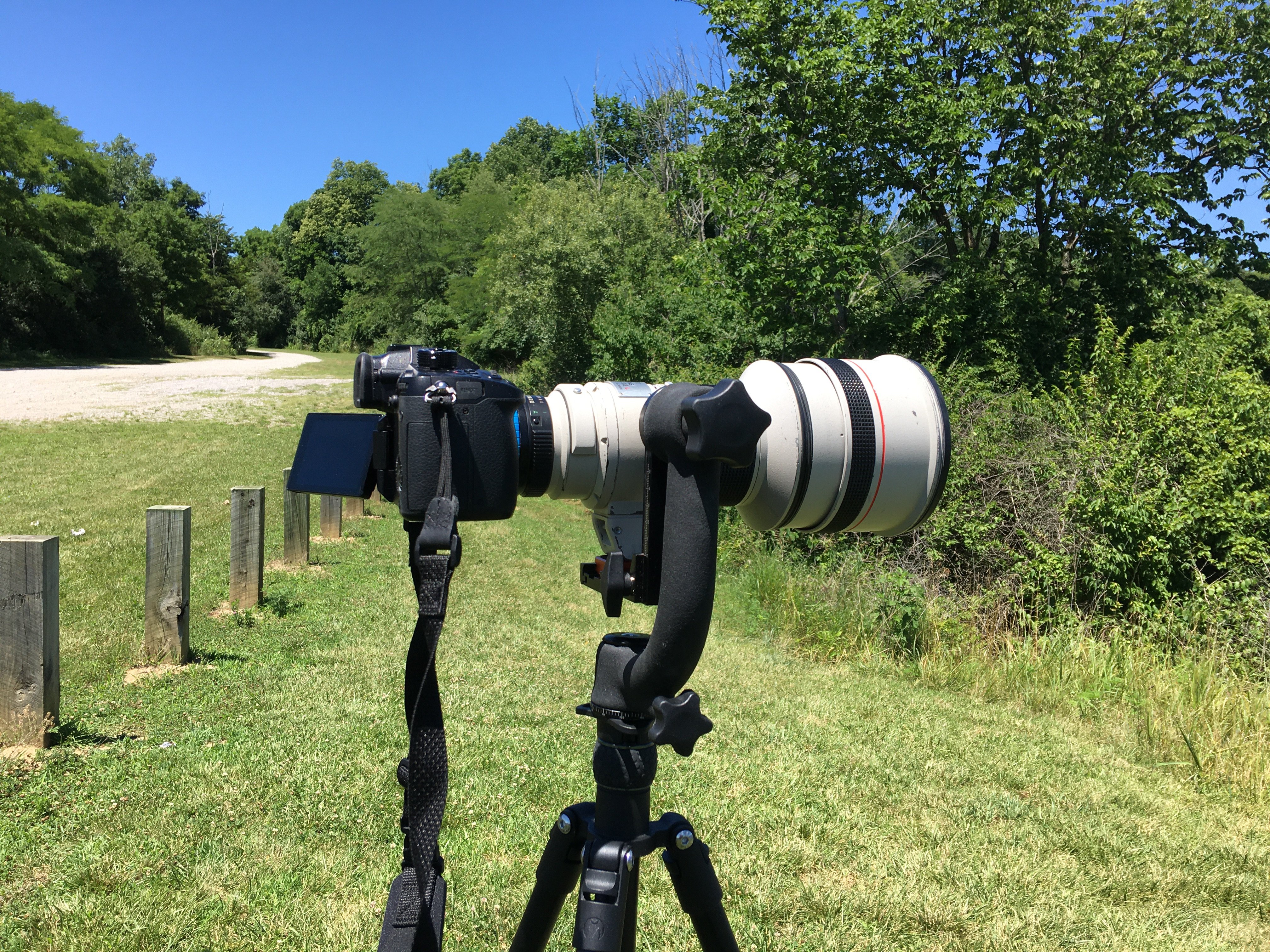 Well 4 shots from today on the GH5. Boat House 14-140mm, last 3 300mm f2.8 L FD lens. The one of the Lodge had to be a nearly 1/4 mile away. The Geese one was maybe 200 feet away, people fishing probably 300 feet away. This looks to be a damn good copy. I can see I need a better tripod for this lens. Had a nice carbon fiber one but it weighed a freaking ton, should have kept it I guess. Camera, lens shot with my iPhone 6s plus. Pretty satisfied on my fist real outing with it. Well, it looks like the photos are switch for bottom to top but you get the idea. Have to figure the 300 is actually a 600 on the GH5.