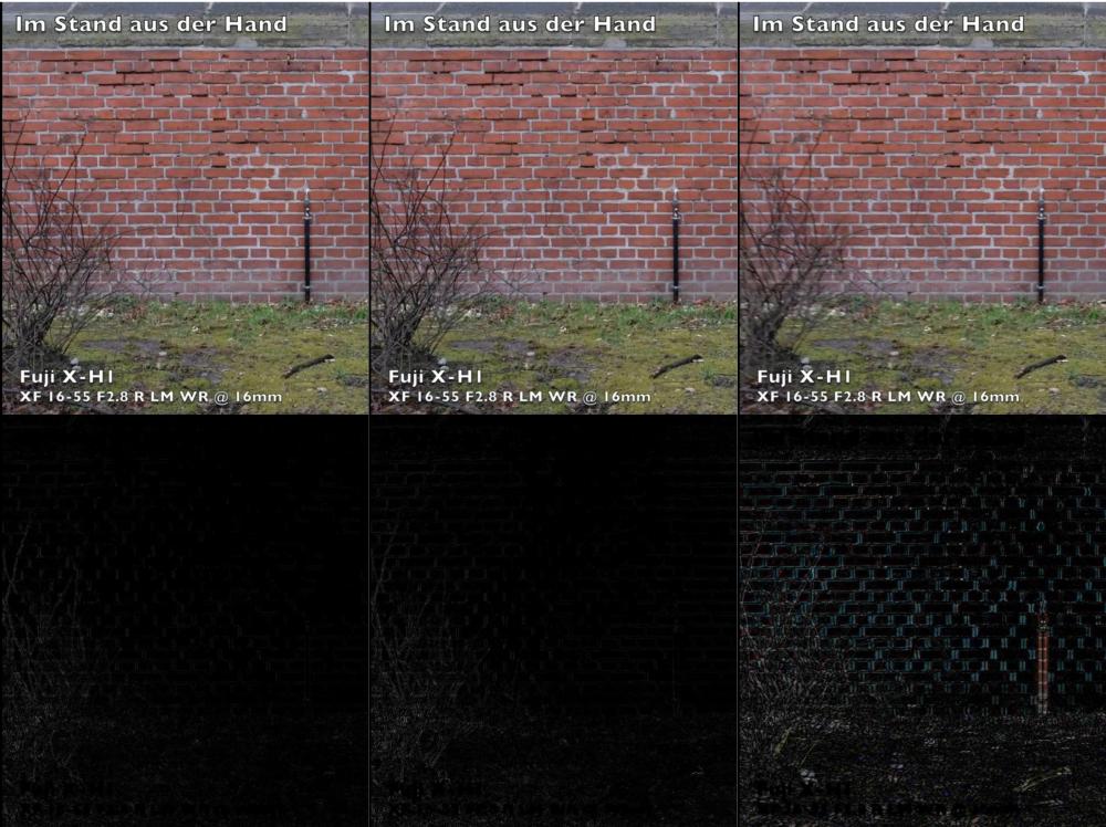 Yeah, the second one was one of the ones I saw where I thought "Have you actually got IBIS enabled on the A7iii ?" and looking at the comments, I wasn't the only one ! In the first video though, whilst it obviously canes the A7iii again, I can still see the same sort of coarse changes. If you look at between 2:07 and 2:10 just as an example, the water pipe does an abrupt move to the left from one frame to another. I've pulled three frames here and done a difference overlay to show how it is transitioning from the first two frames (where nothing much but the bush is moving) to the one where it has to do some work and makes the jump. In the brickwork, there is slewing as might be expected but also some scaling changes that all adds up to a bit of a mess that I think is what is making it so jarring. I'm not some mad pixel peeper as a rule but some of these transitions I'm seeing are very rough as are the less than subtle scaling changes even when its not being taxed too much. Its like a Scooby Doo transition at times though