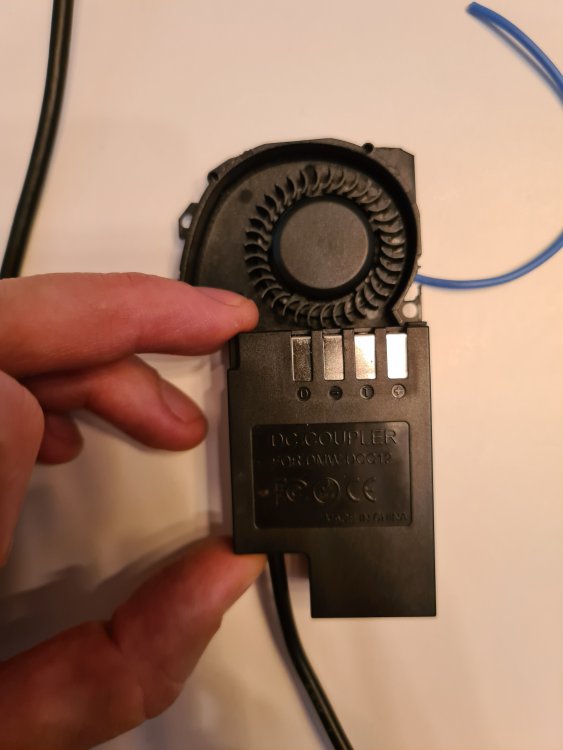 Assuming the R5 does in fact overheat and that additional cooling is beneficial, I just thought of a fan-placement I haven't seen before (perhaps with good reason). I usually use a dummy battery because I prefer to use LP-F batteries. A radial fan would actually fit inside the dummy battery. Cutting down on the left size of the exhaust might degrade the performance somewhat, but it should still work.. It is also half the height of the dummy battery (picture 2), which makes it possible to make half the height for exhaust and half for intake. The dummy battery already has 7.4v, hooking up a 12 V fan gives a nice breeze without much noise. It might be too noisy for the internal microphones, but is silent >10 cm away. This is not the hottest place on the camera, but any cooling is better than no cooling and the advantage of this over other cooling methods is that it would have zero impact on the ergonomics of the camera for anyone who is already using a dummy battery. To make this work, the dummy battery should have the casing removed in the direction it's supplying the main cooling. Alternatively it could be open on both wide sides but have barrier in the middle to separate the intake and the exhaust, giving it the shape on an H pillar. Sorry for the oversized images, I couldn't figure out how to resize it. -
